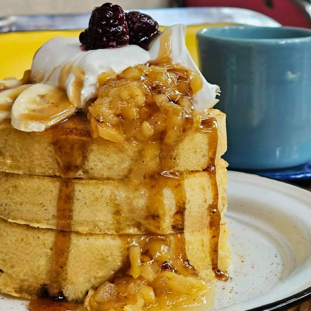 Tres piezas, con compota casera de temporada, fruta, crema batida y miel de maple.