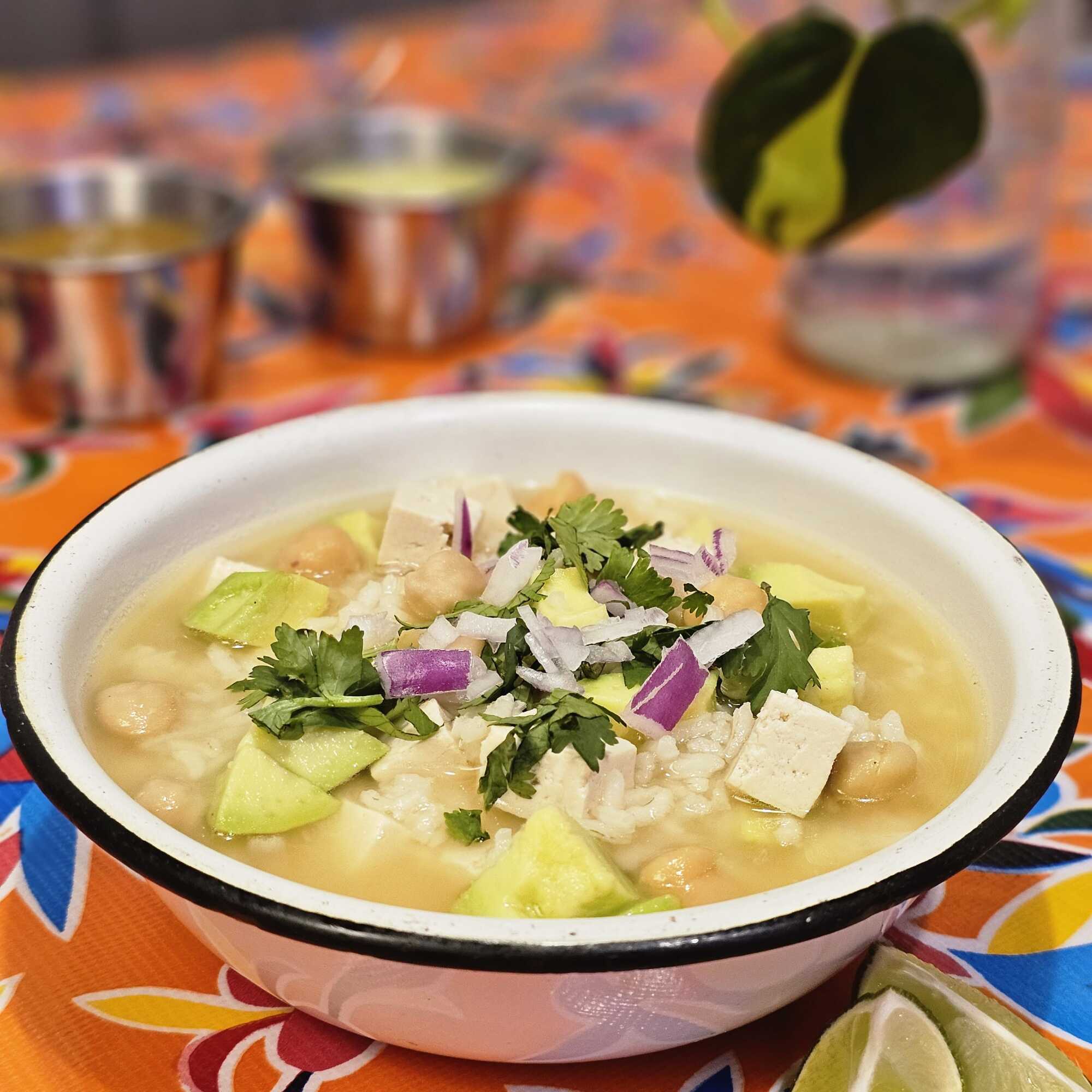 Consomé con base de miso, con arroz, garbanzos, tofu y aguacate