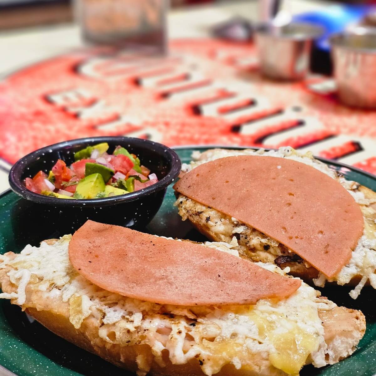 Dos piezas de pan, frijoles refritos, mix de quesos (muzzarela y manchego) gratinados y jamòn. Acompañado de pico de gallo con aguacate.