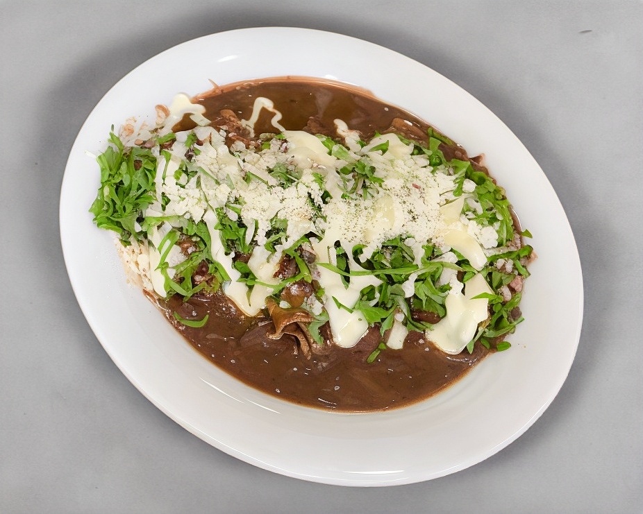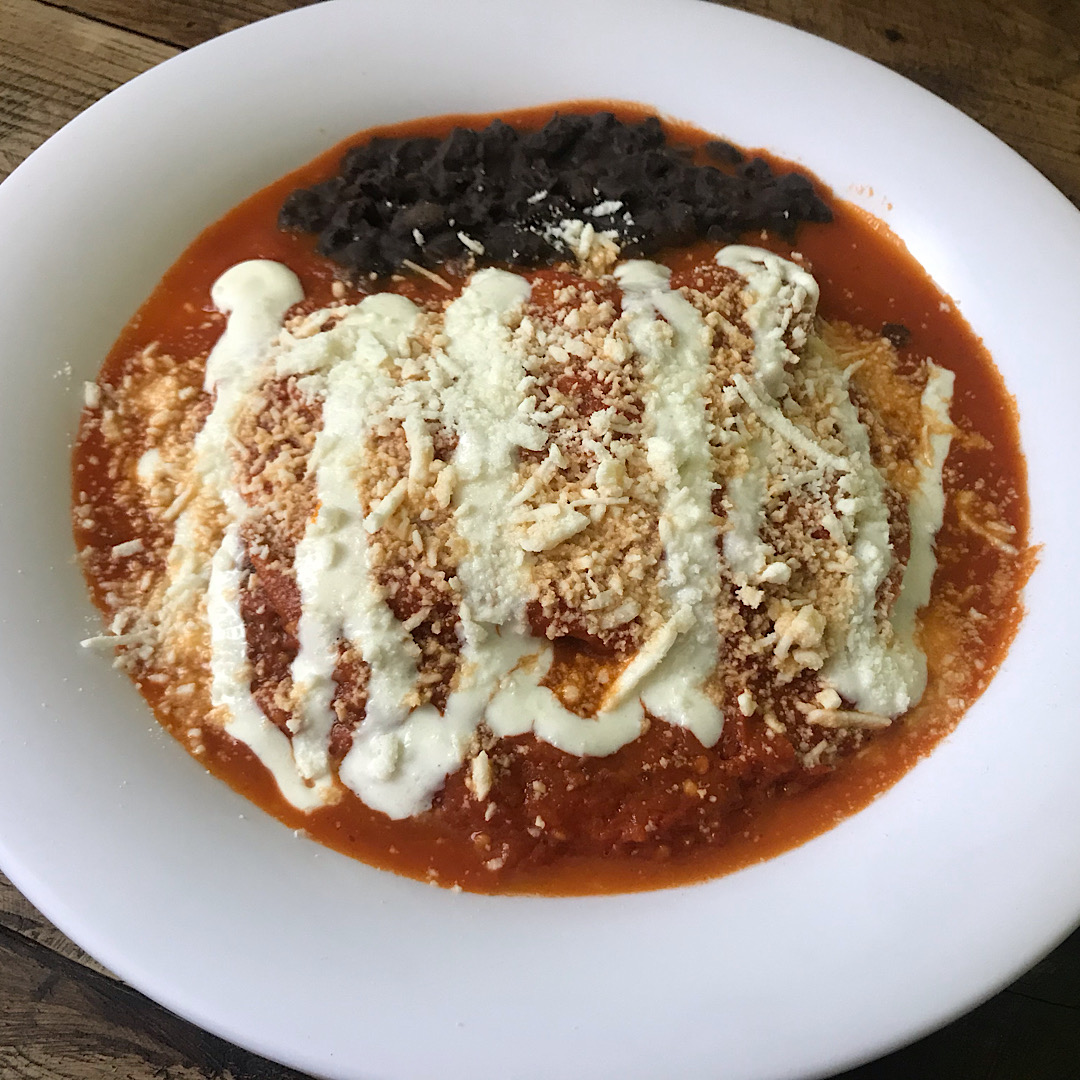 Enfrijoladas de Pollo*1 + Jugo o fruta*1 + Café o té*1