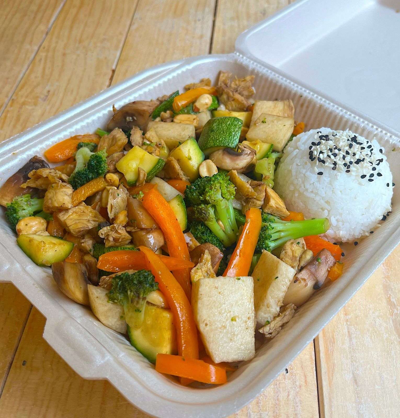 ¡Nuevo! disfruta de nuestro nuevo platillo acompañado con 5 vegetales de tu preferencia salteados en soya con pollo asado y cacahuates, acompañados de arroz gohan.