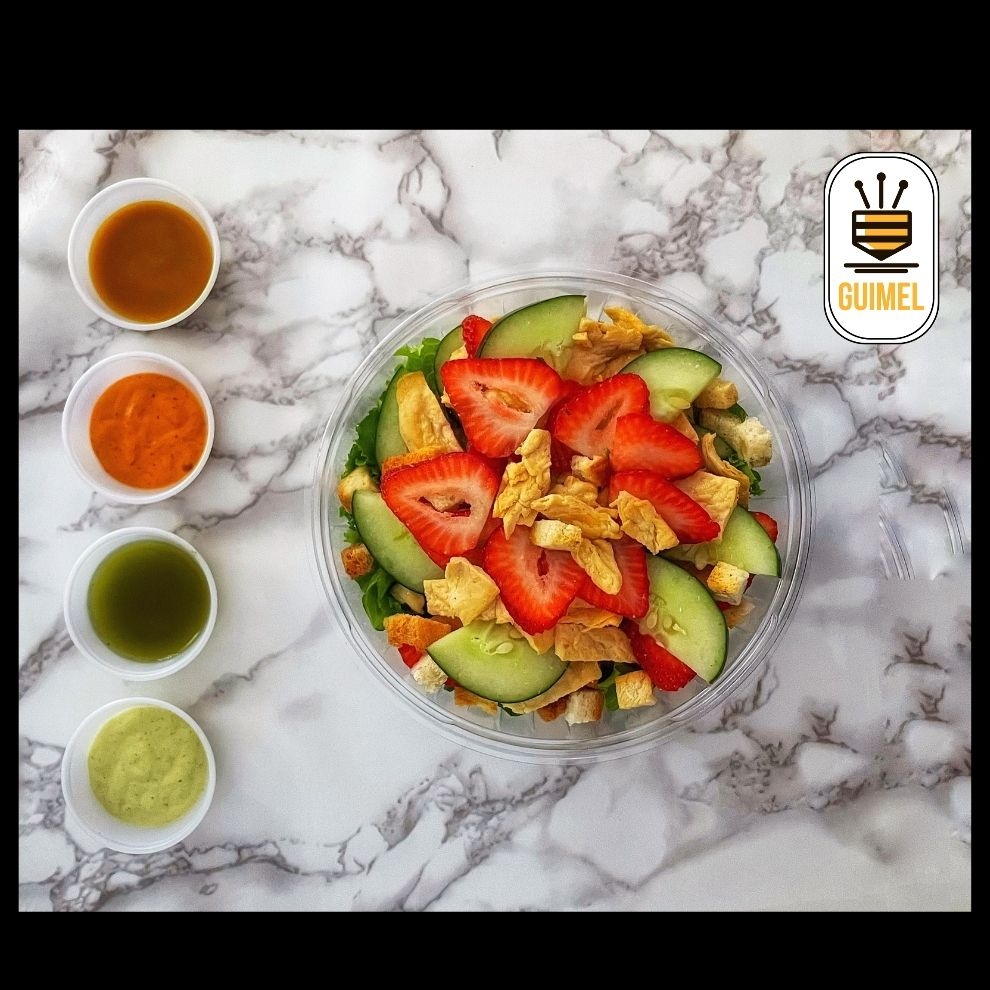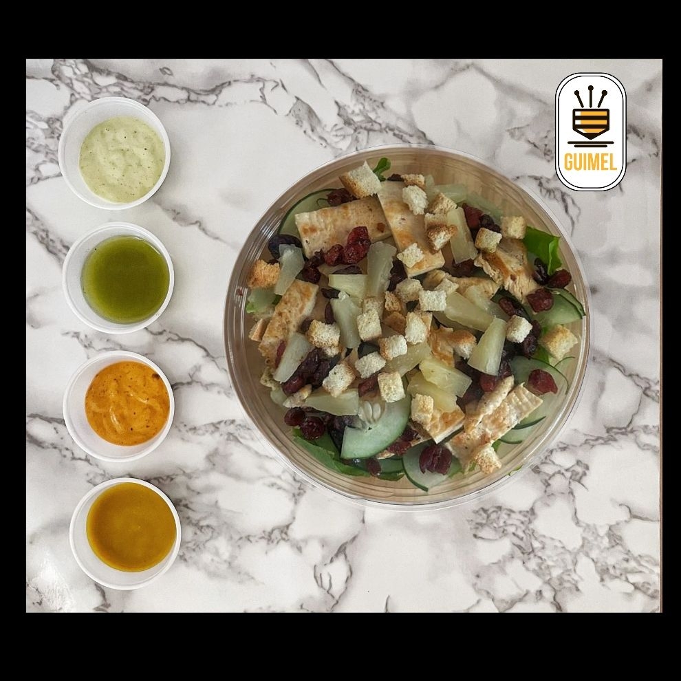 Piñ, pepino, crutones,pollo asado y arándanos.