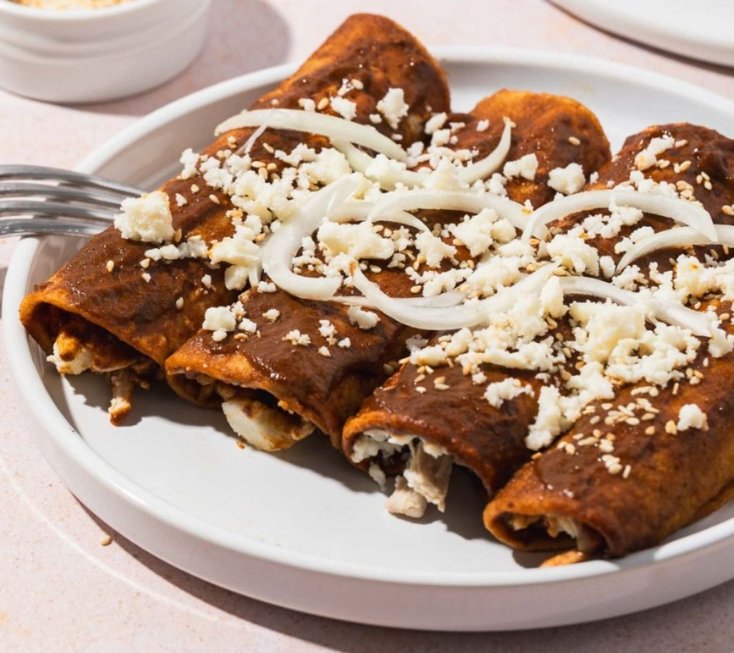 Sabrosa enchiladas de mole con pollo, son 4 piezas, acompañadas de frijoles, pan y café chico