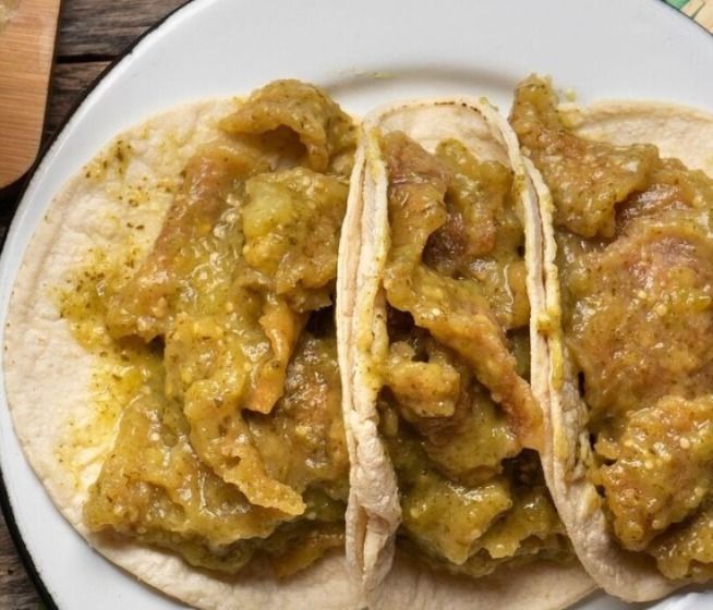 Sabroso Taco de chicharrón en salsa verde, tortilla número 14 con arroz.