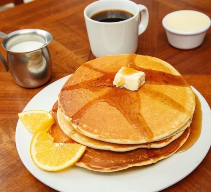Deliciosos y calientitos Hot cakes (4 pzas Del #15 aprox) acompañados de café chico.