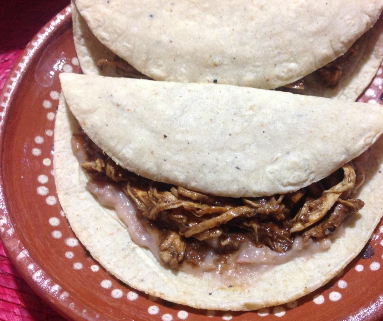 Sabroso Taco de pollo con mole en tortilla número 14 con arroz.