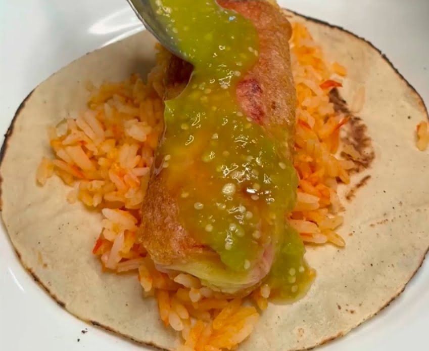 Rico Taco de rollito de jamon empanizado relleno de queso con arroz endoble tortilla de maíz número 11