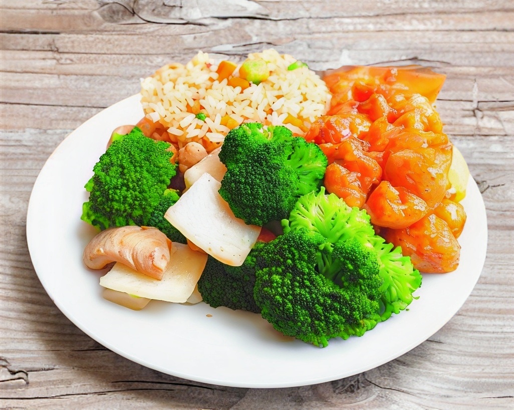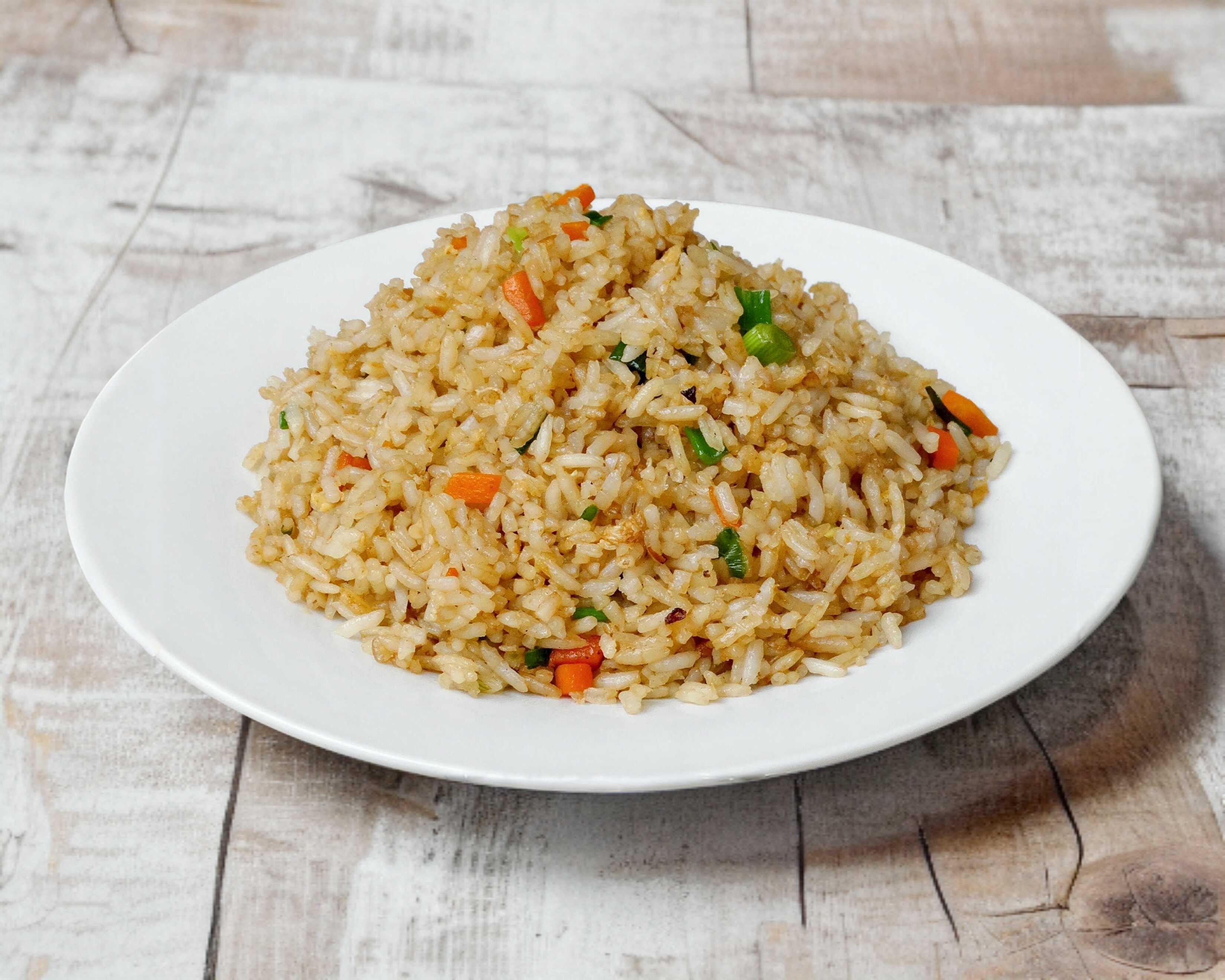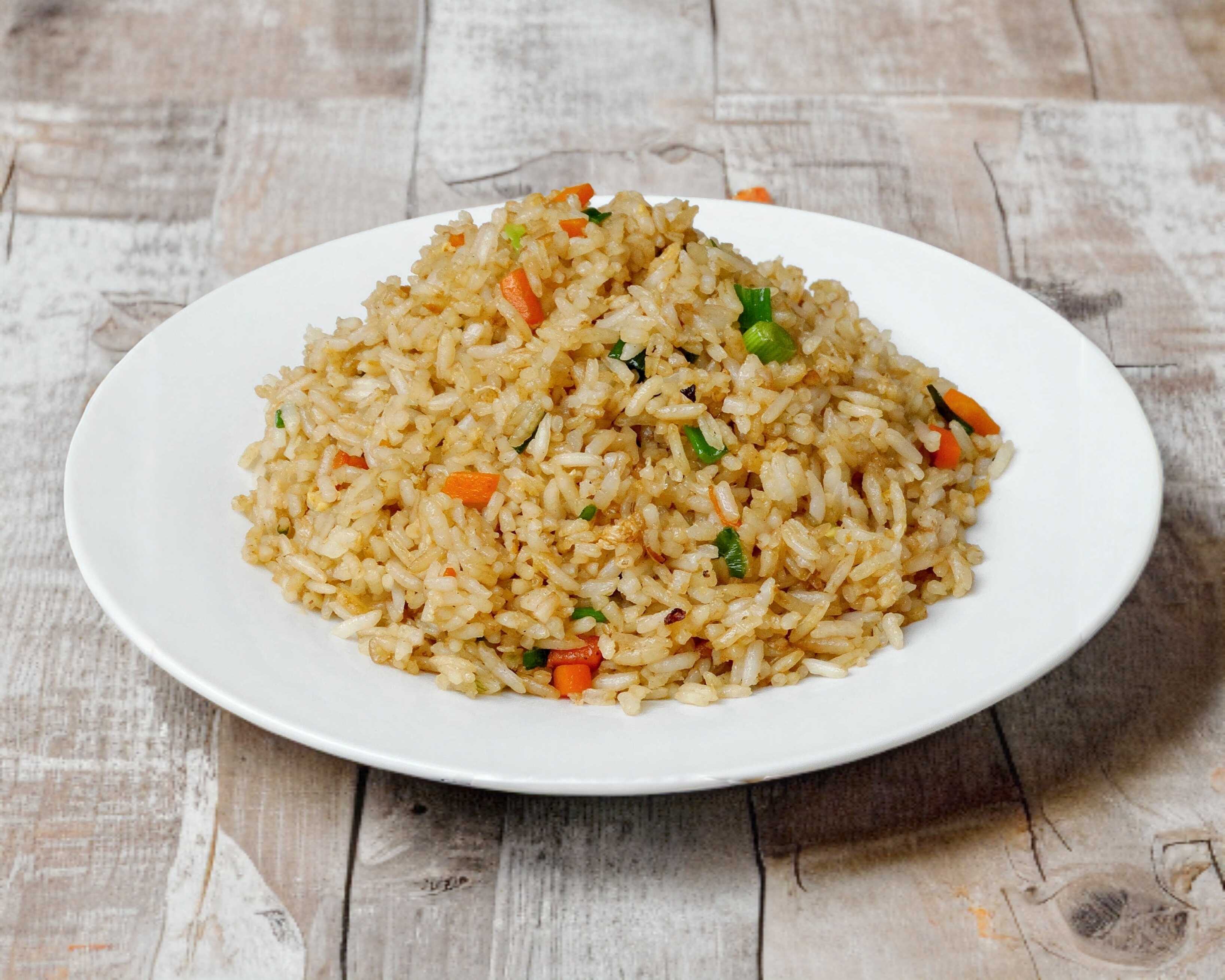 Arroz chino en porción completa, una guarnición perfecta acompañada de frescas verduras.