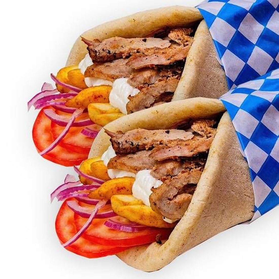 Llévate 2 Gyros | Deliciosa Carne receta el Greco acompañado de rodajas de jitomate, cebolla morada fresca y papas adentro, envuelto en nuestro pan pita de la casa. Acompañalo Salsa de yogurt griego abundante, picante al gusto.
