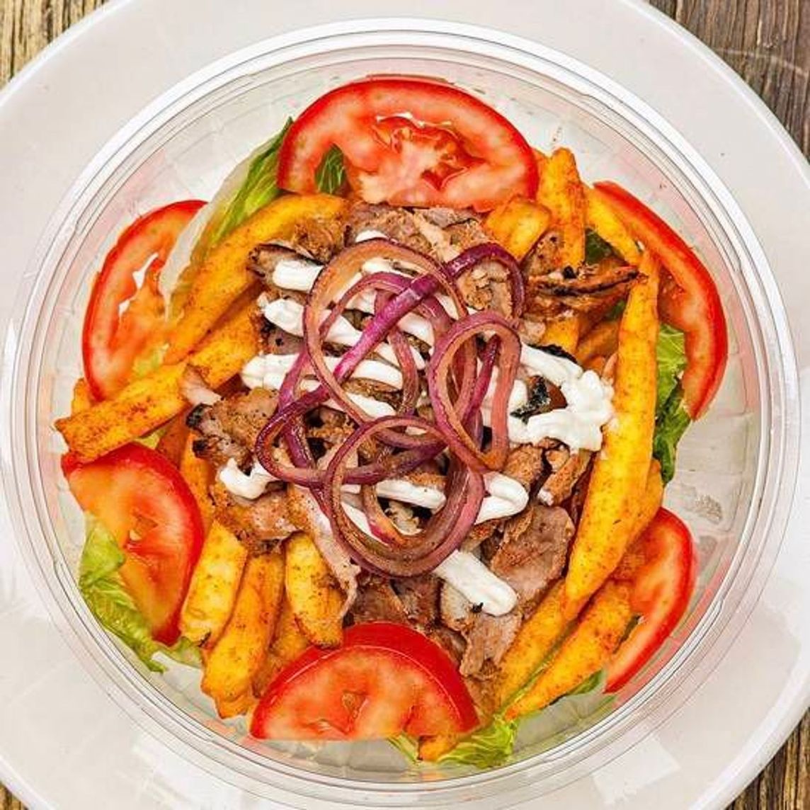 Cama de lechuga coronada con papas a la francesa con porción de Carne el Greco, queso de cabra, cebolla asada y jitomate. Acompañada con salsa de yogurt abundante y picante.