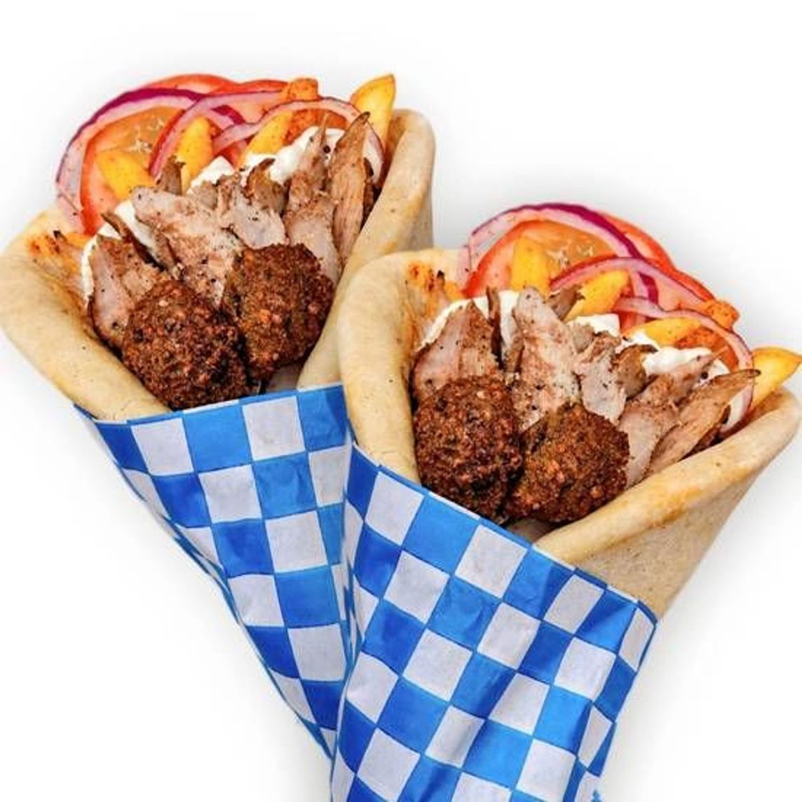 Llévate 2 Gyros | Deliciosa Carne receta el Greco más Falafel acompañado de queso de cabra, rodajas de jitomate, cebolla morada fresca y papas adentro, envuelto en nuestro pan pita de la casa. Acompañalo Salsa de yogurt griego abundante, picante al gusto.