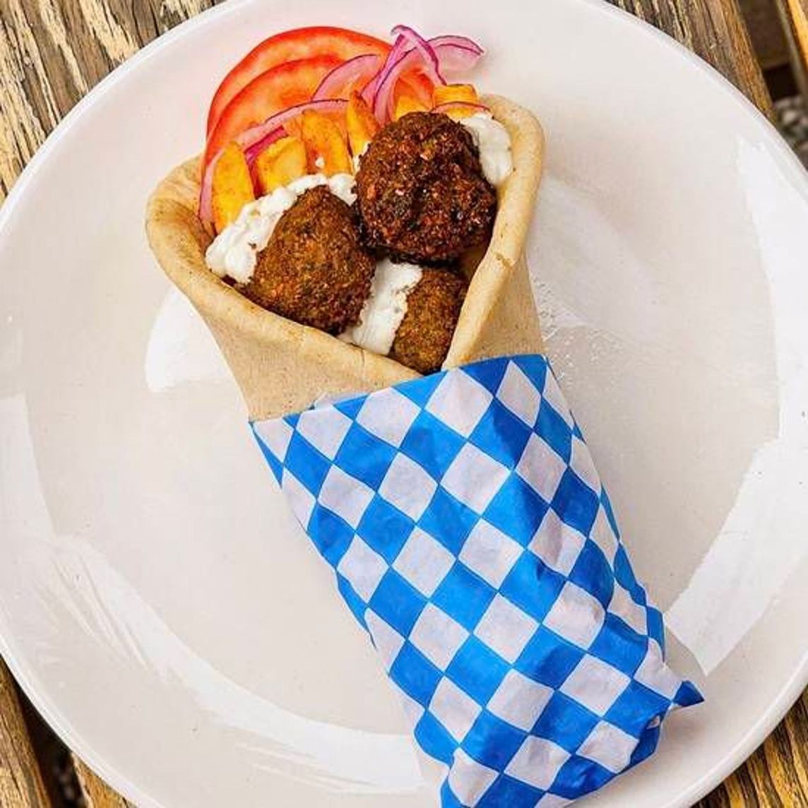 Deliciosas croquetas de falafel acompañado de queso de cabra, rodajas de jitomate, cebolla morada fresca y papas adentro, envuelto en nuestro pan pita de la casa. Acompañalo Salsa de yogurt griego abundante, picante al gusto.