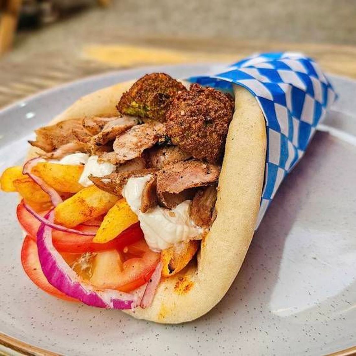 Deliciosa Carne receta el Greco más Falafel acompañado de queso de cabra, rodajas de jitomate, cebolla morada fresca y papas adentro, envuelto en nuestro pan pita de la casa. Acompañalo Salsa de yogurt griego abundante, picante al gusto.