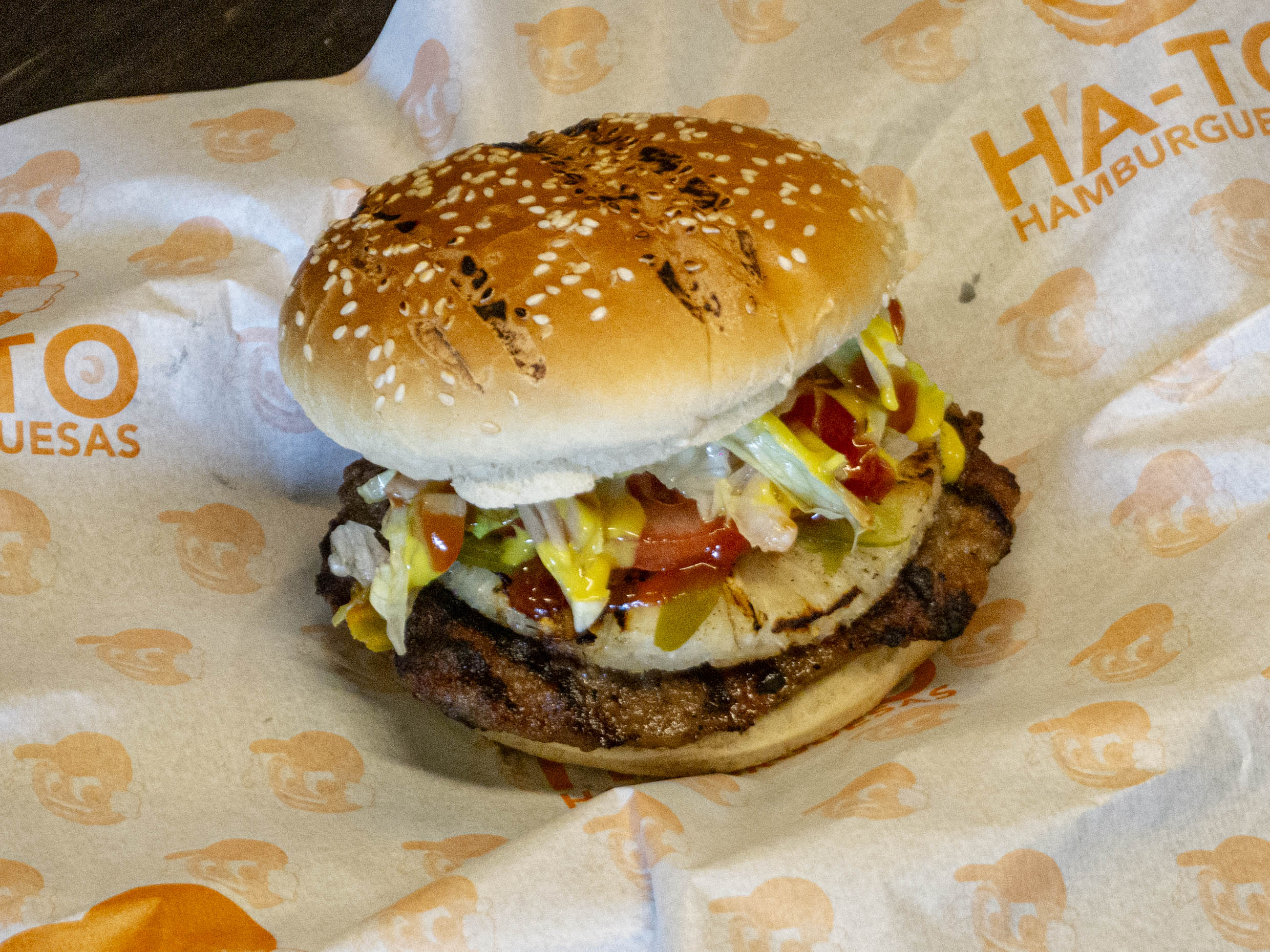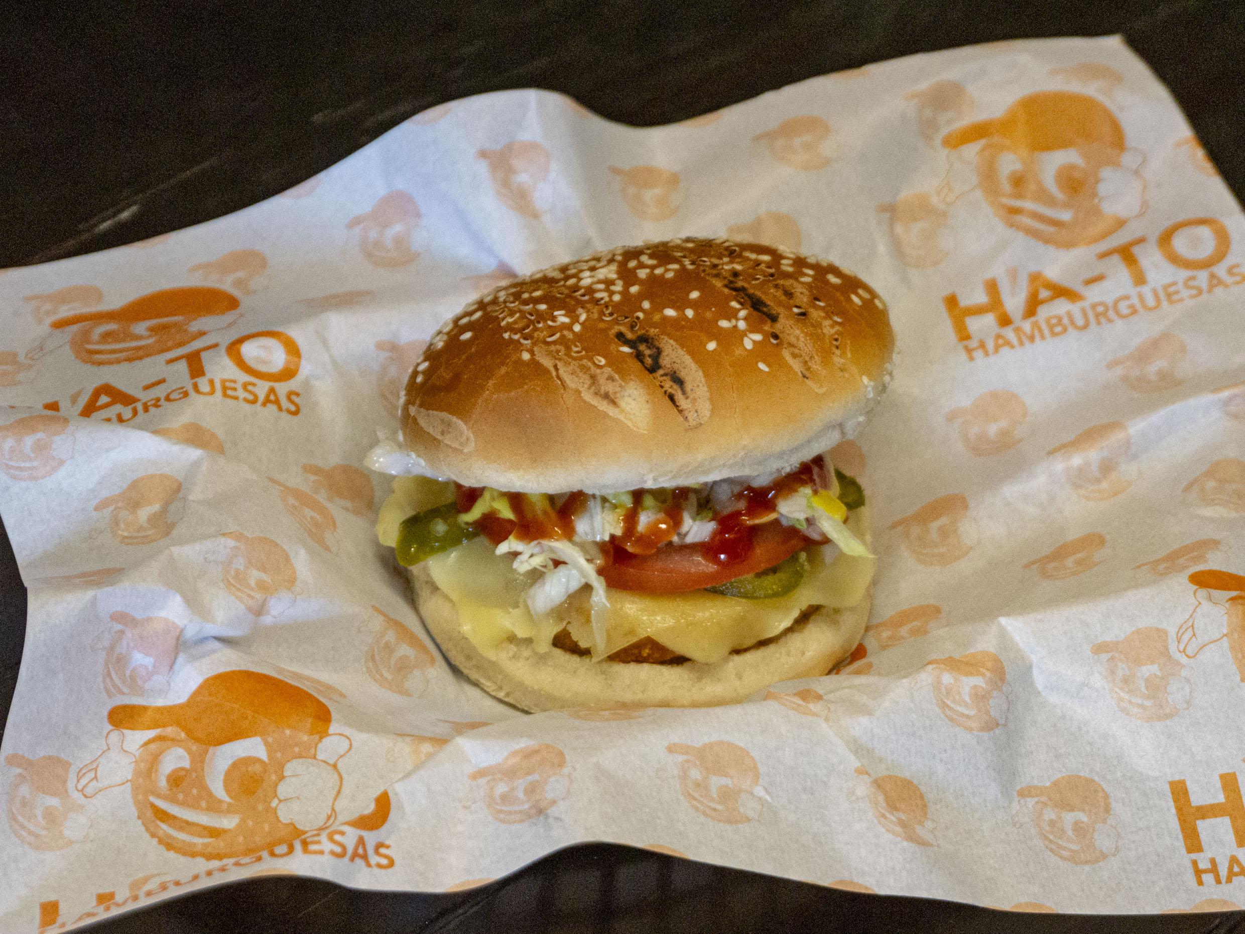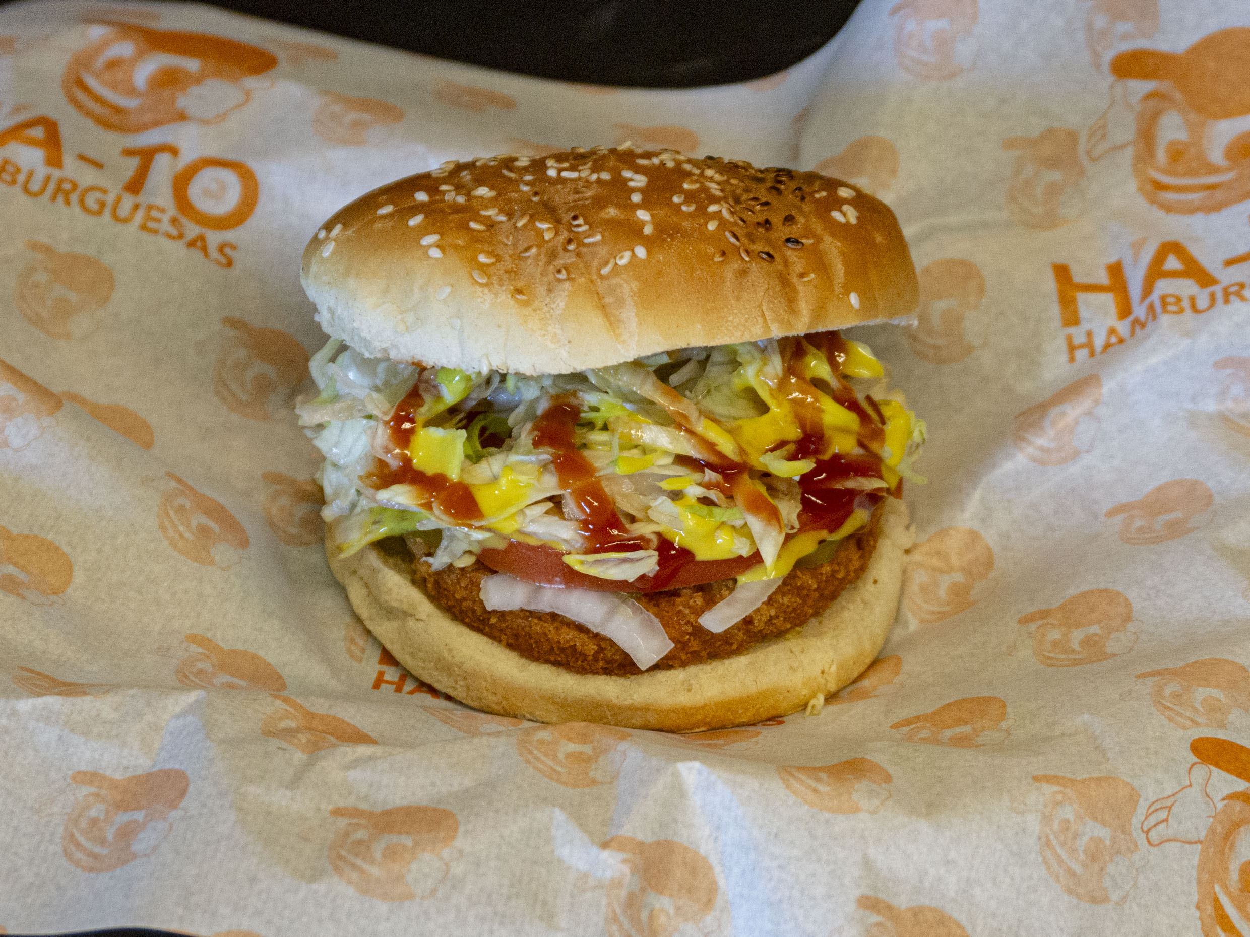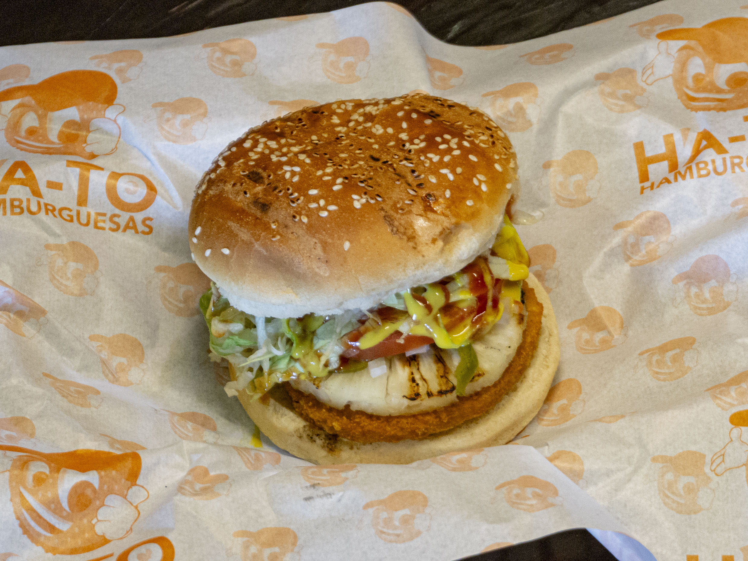 Pan, hamburguesa de pollo,2 rebanadas de queso manchego, jitomate. lechuga, cebolla, chiles en vinagre