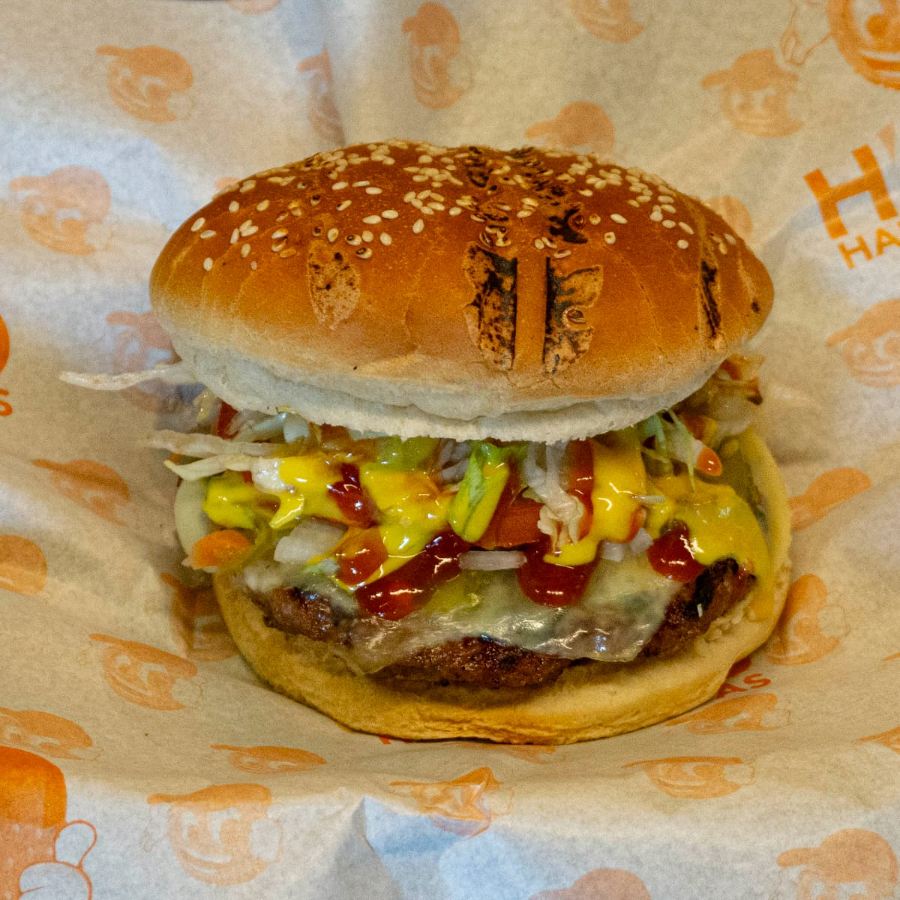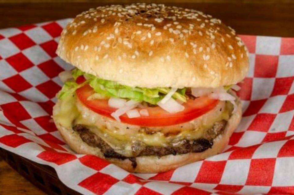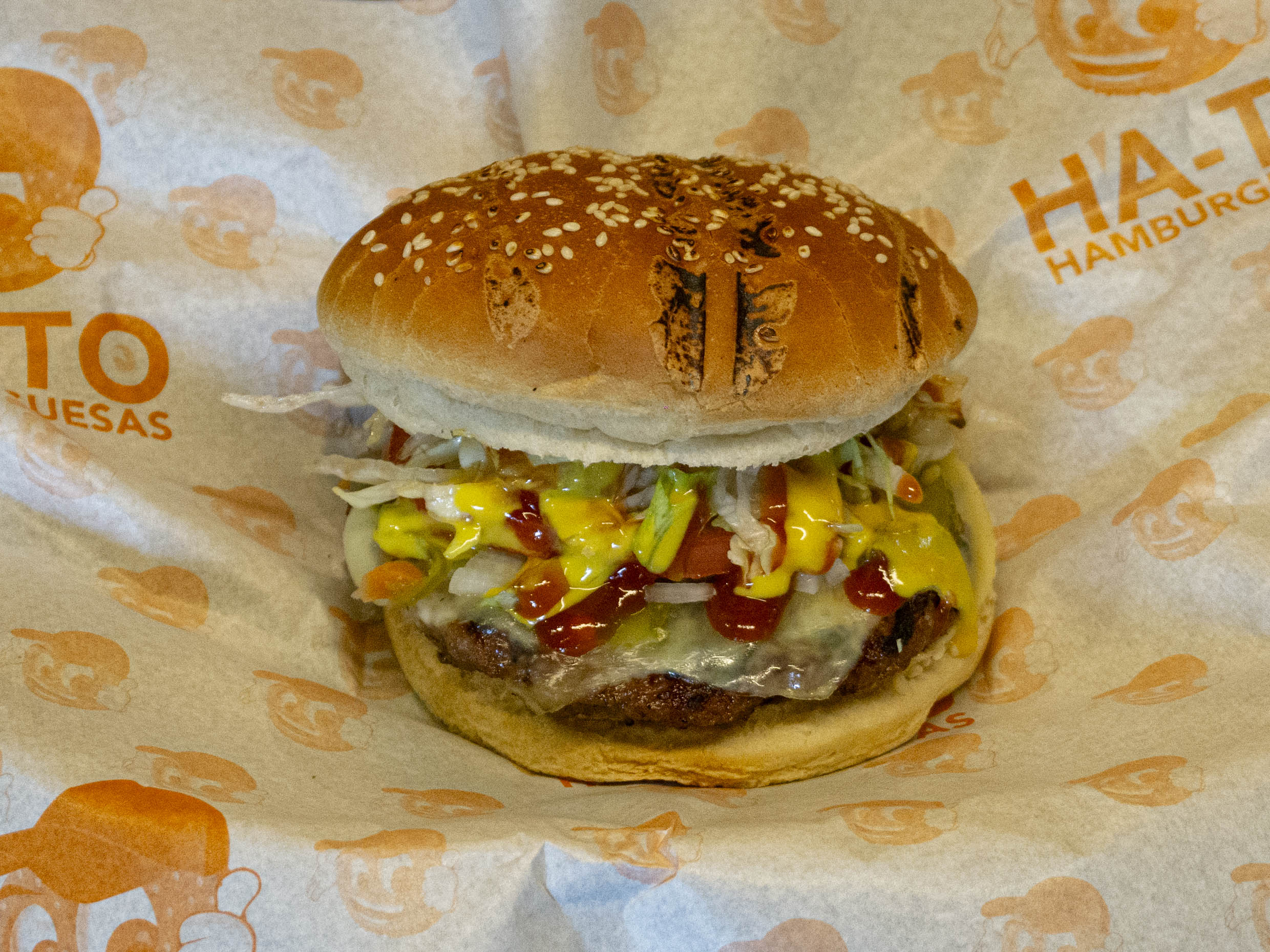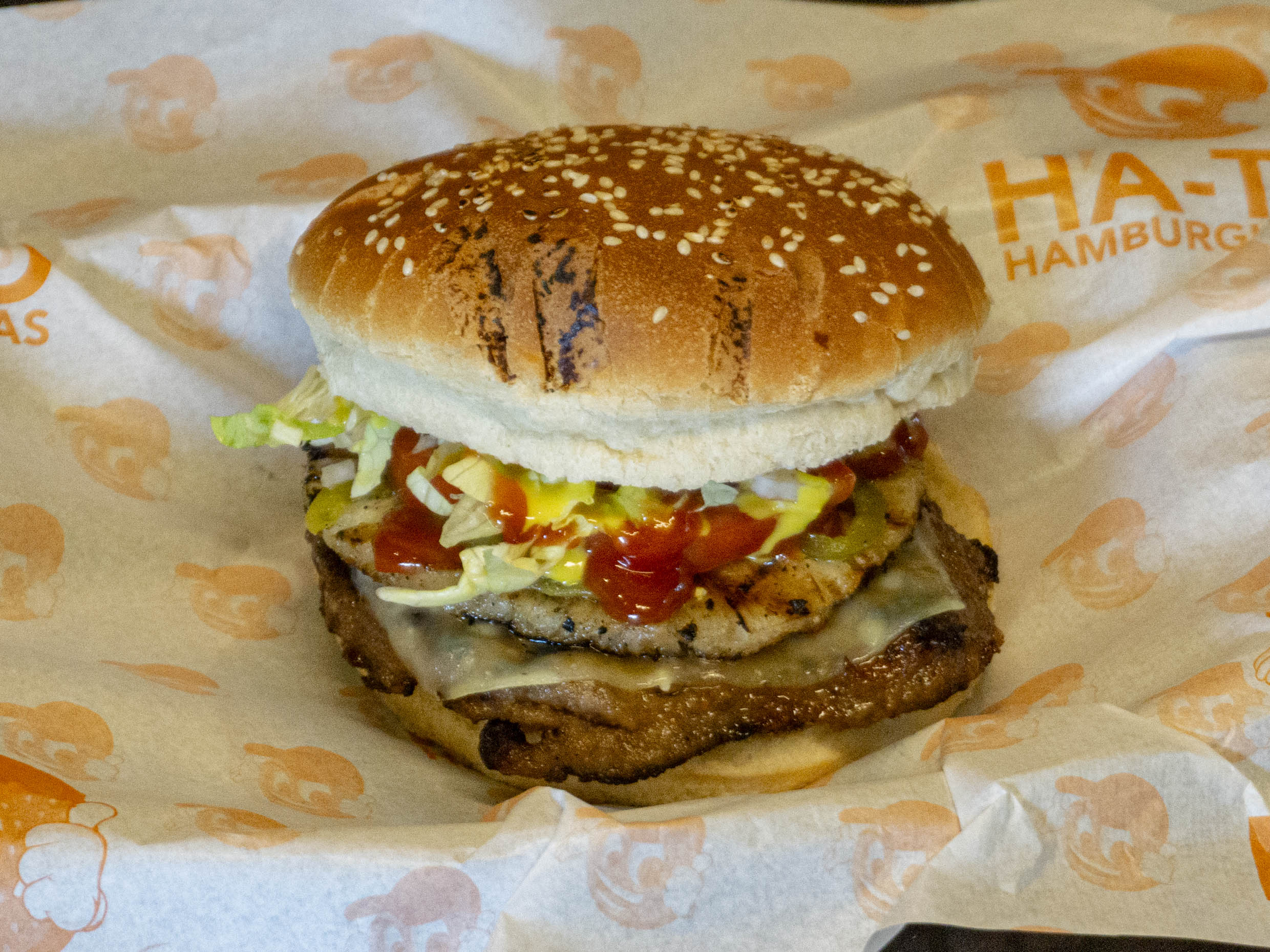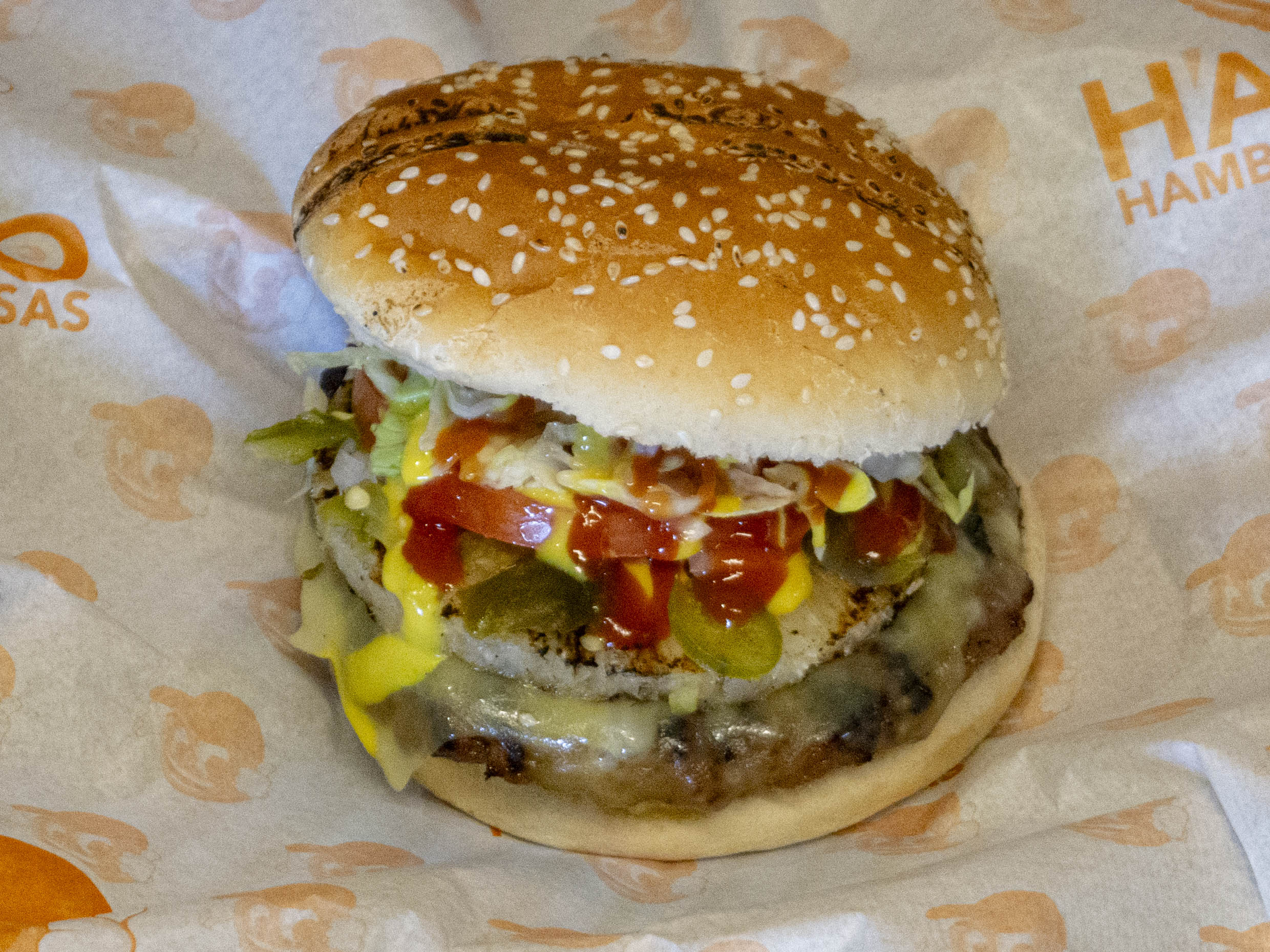 Pan, hamburguesa de pollo,2 rebanadas de queso manchego, jitomate. lechuga, cebolla, chiles en vinagre