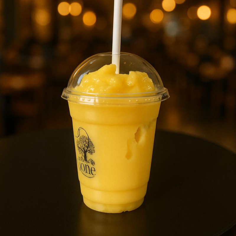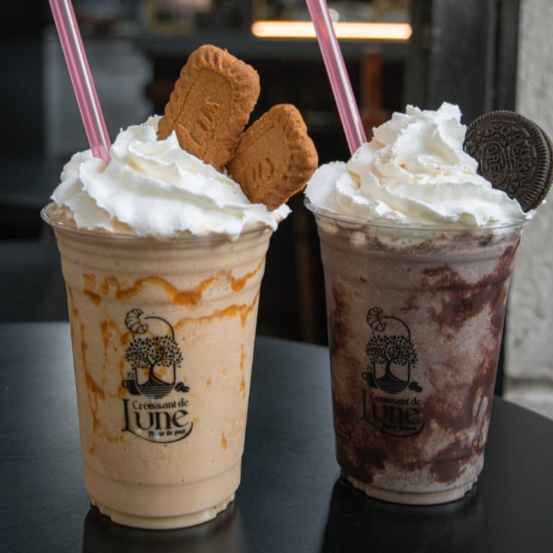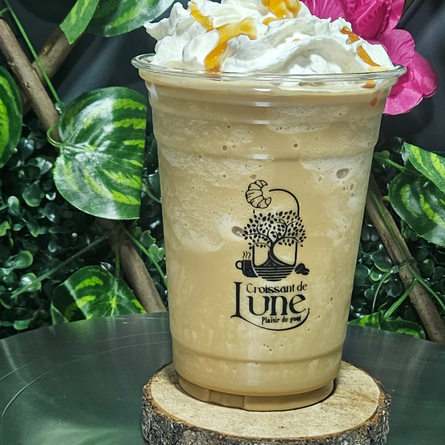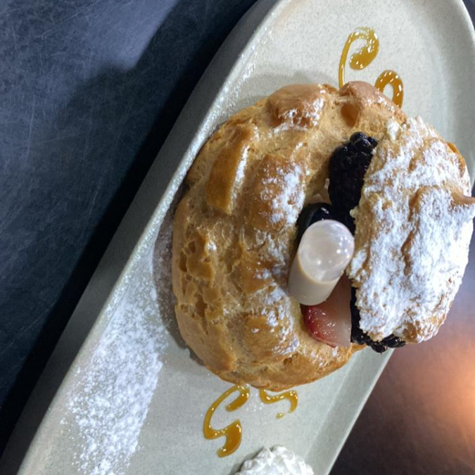 Bola gramde de masa choux rellena de crema pastelera, crema batida y frutos rojos con un shot de Baileys