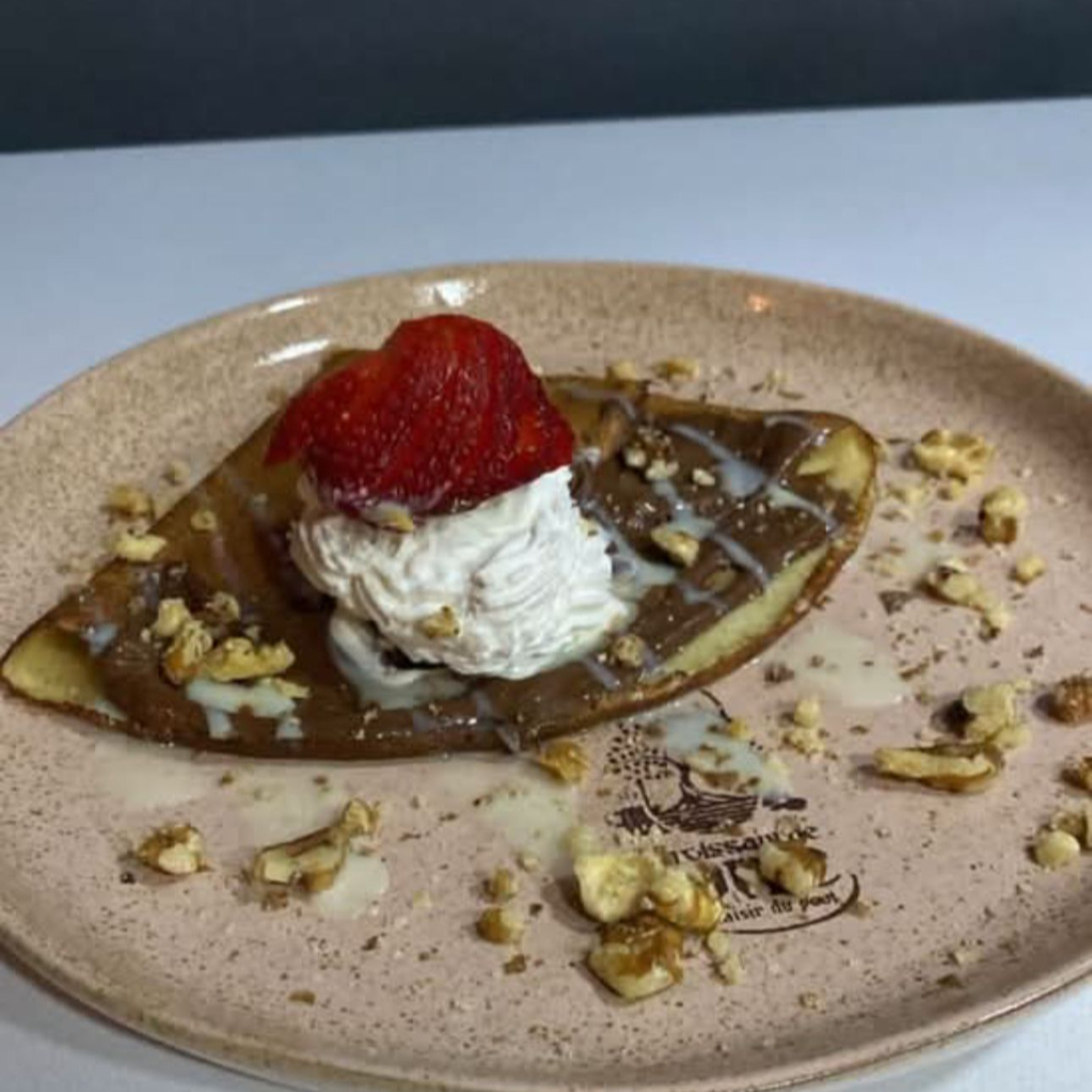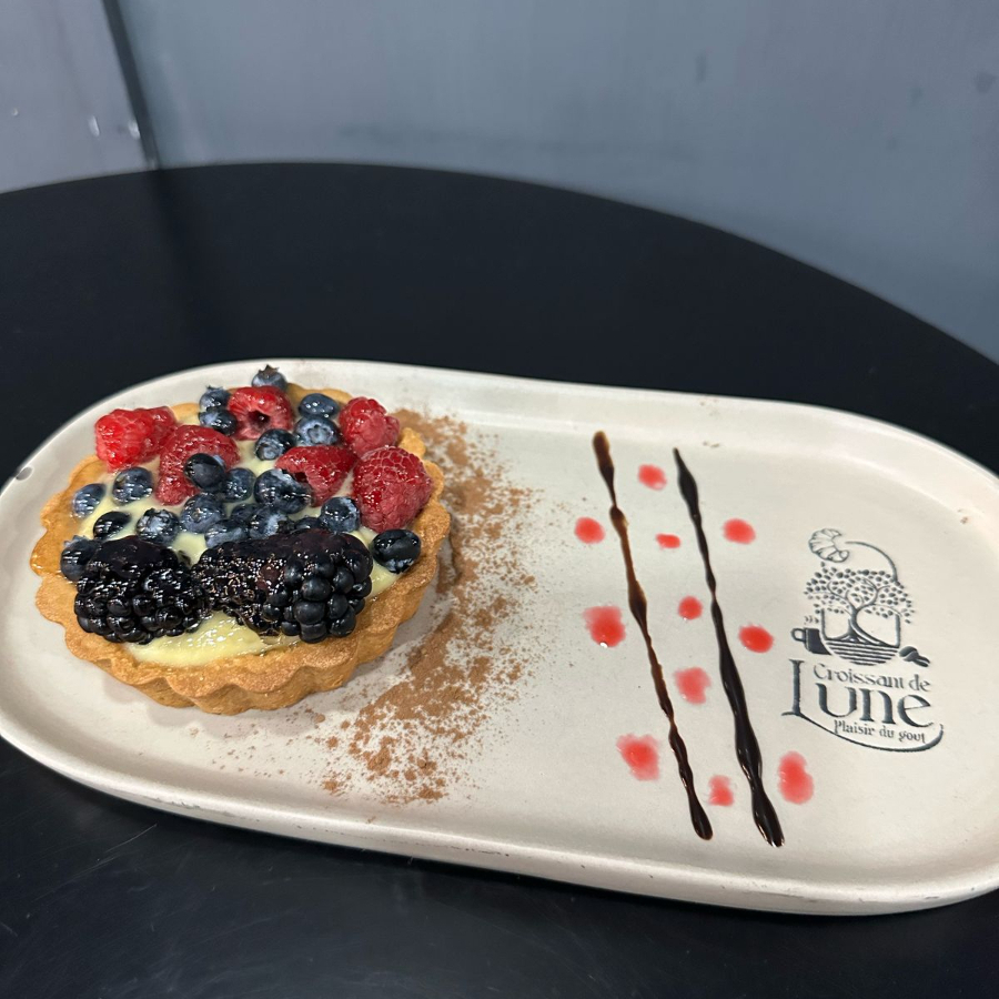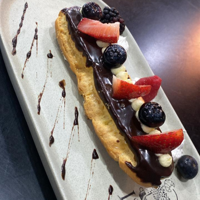 Masa choux rellena de crema pastelera cubierta de chocolate, crema batida y frutos rojos