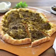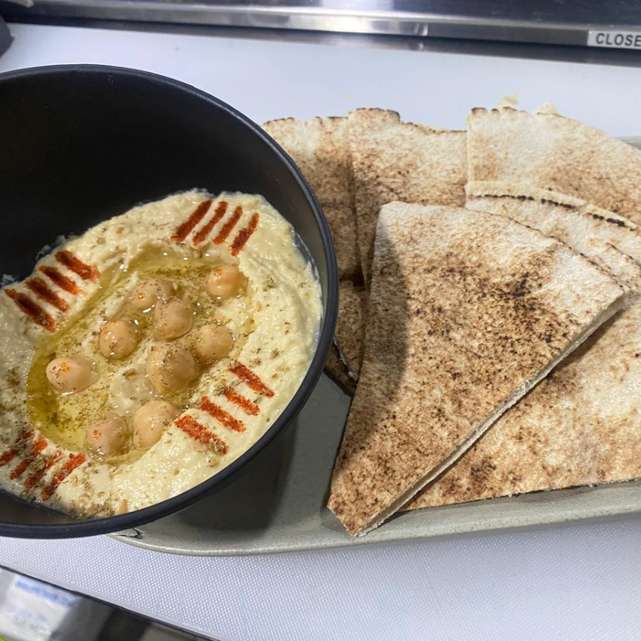 Carne molida con especias libanesas, hummus, jitomate, perejil y cebolla