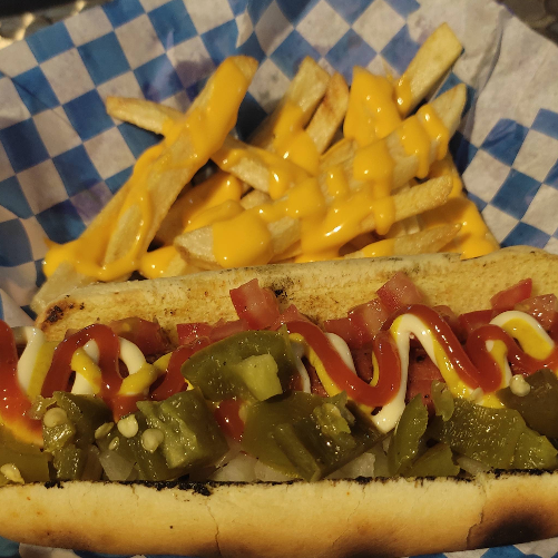 Sanchicha XL, acompañado de mayonesa, catsup, mostaza, cebolla, jitomate y chile jalapeño.