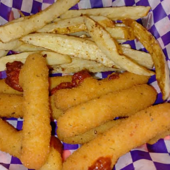 6 piezas de dedos de queso, acompañados con media orden de papas con queso amarillo, catsup y salsa picante