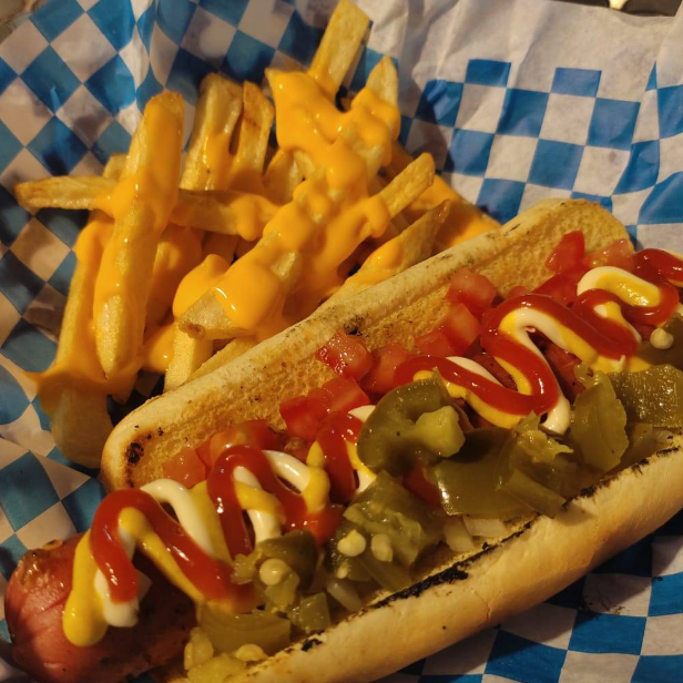 Sanchicha XL con tocino y queso Oaxaca, acompañado de mayonesa, catsup, mostaza, cebolla, jitomate y chile jalapeño.