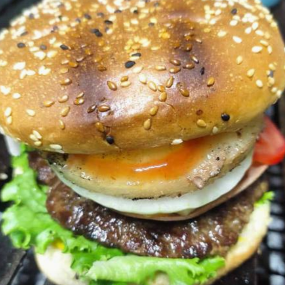 2 carnes de ¼ de libra 100% de res, queso amarillo, queso Oaxaca, tocino y aros de cebolla, acompañada con mayonesa, mostaza, catsup, jitomate y chile jalapeño.