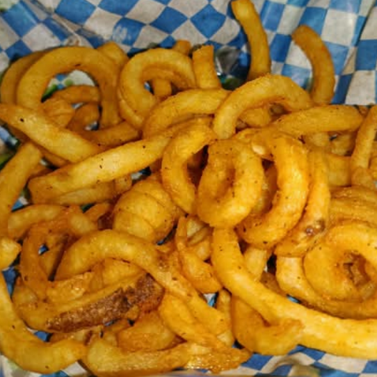 Una orden de papas curly bañadas con queso amarillo, catsup y salsa picante