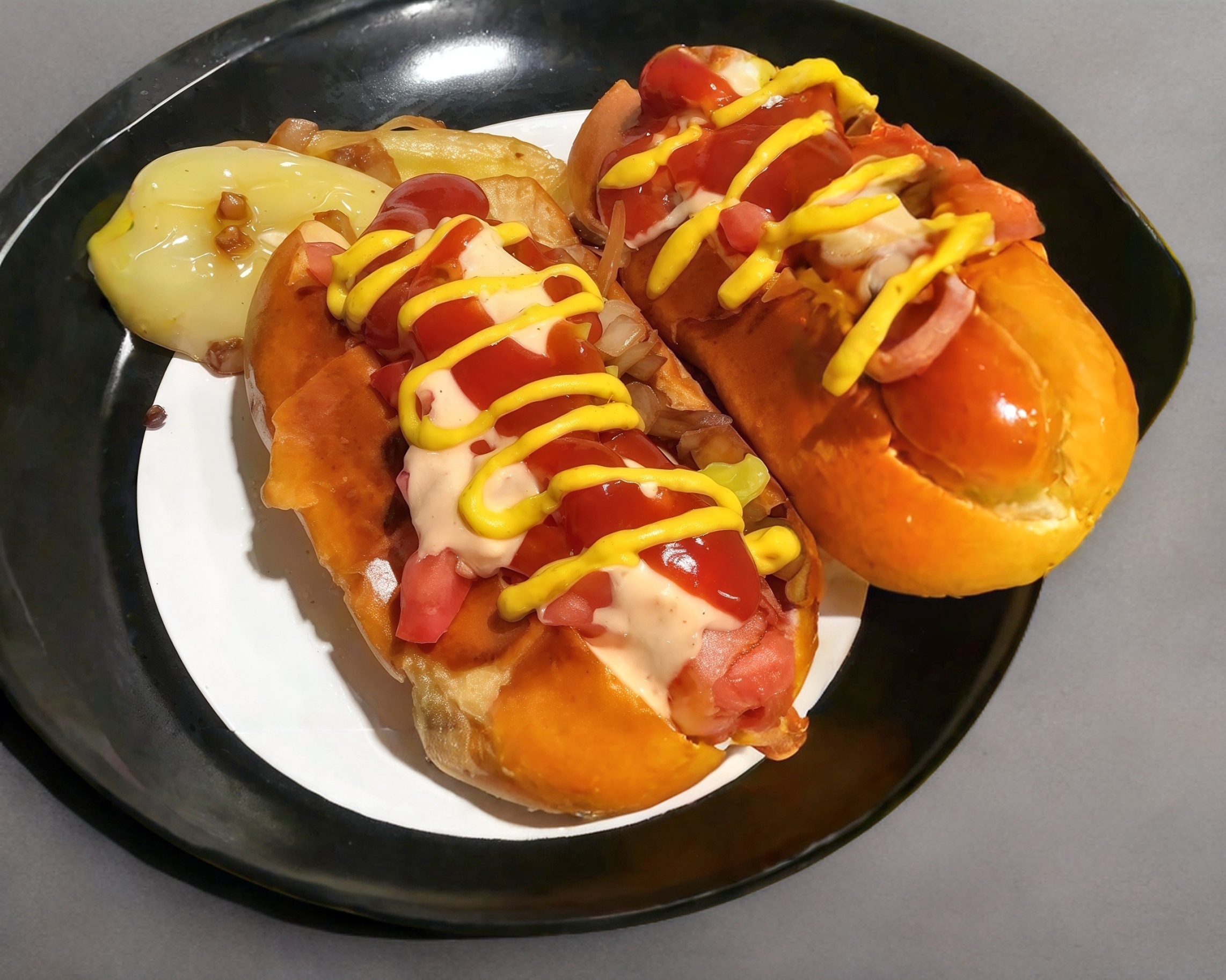 Salchicha Queso Oaxaca tocino jitomate cebolla chile mayonesa mostaza mostaza