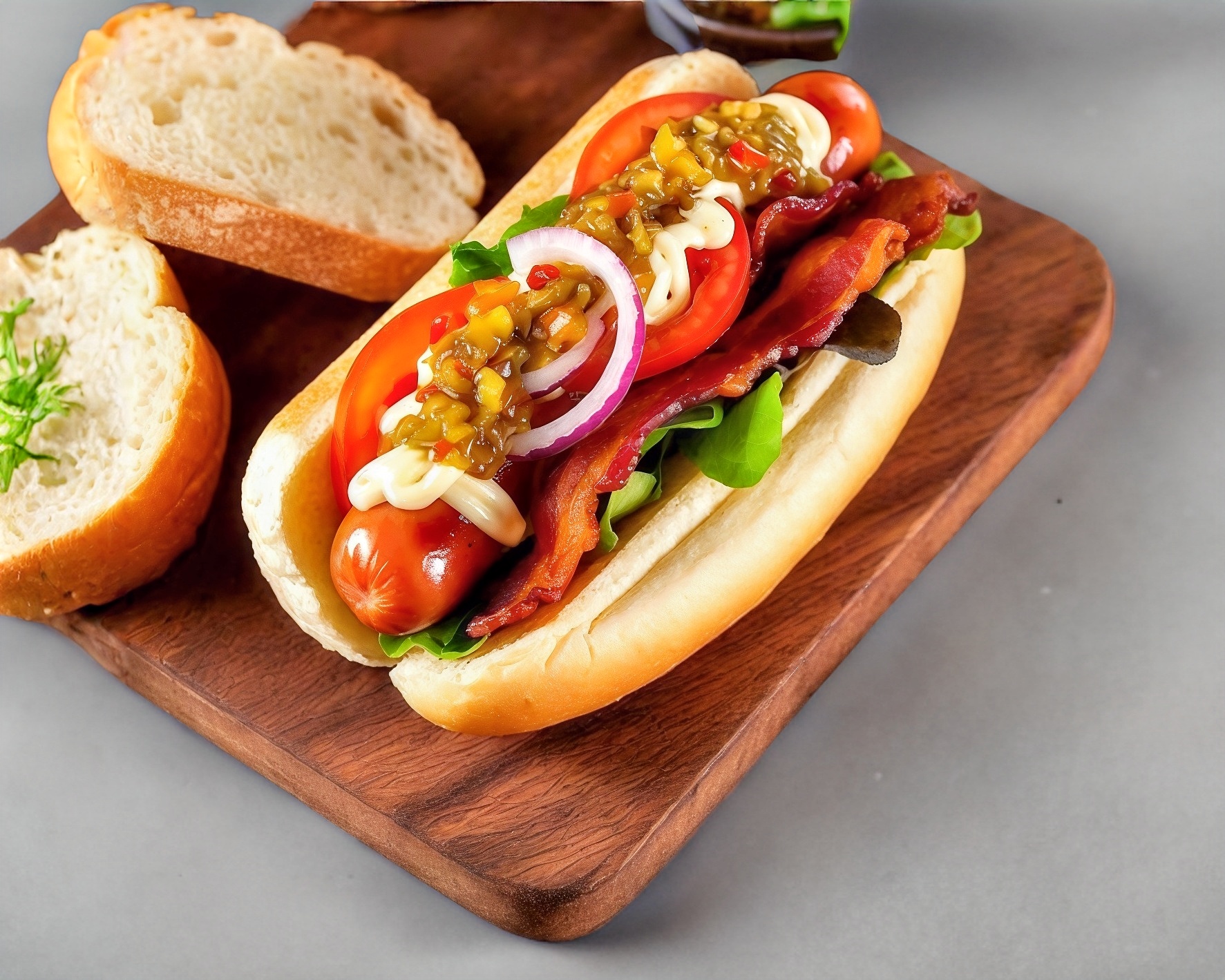 Salchicha tocino catsup mayonesa mostaza lechuga jitomate cebolla chile