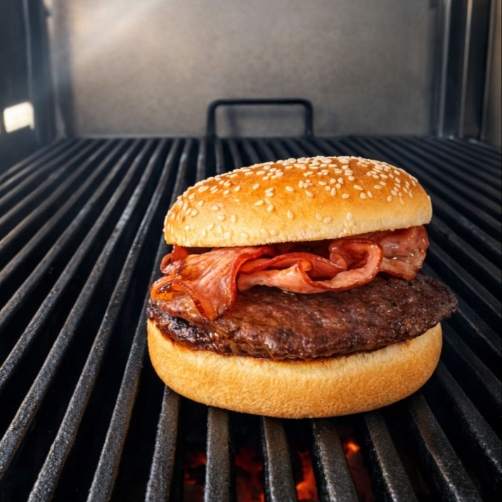 Deliciosa Hamburguesa de res al carbón con doble rebanada de tocino.