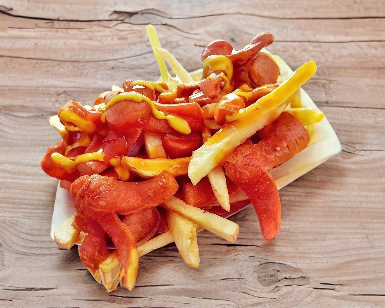 Con papas a la francesa, jitomate, cebolla, picante, cátsup y mostaza.
