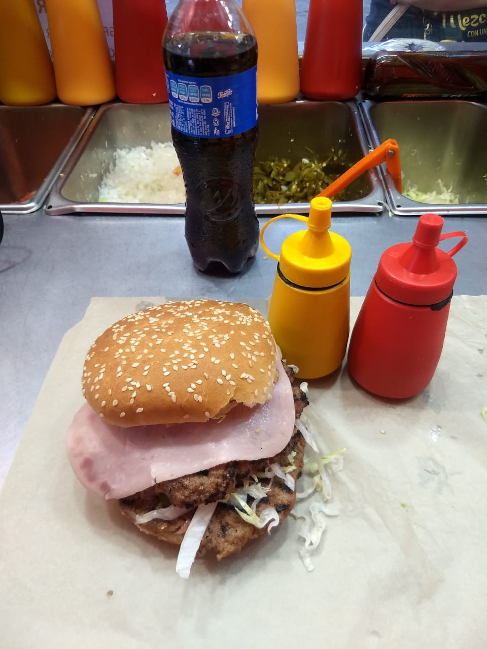 Con mayonesa captsup ,moztaza jitomate,lechuga cebolla y jalapeños