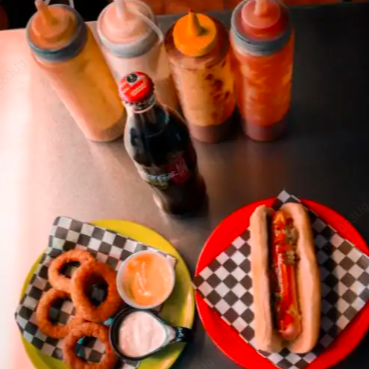 Hot dog tamaño normal, papas a la francesa o aros de cebolla y bebida de su preferencia.