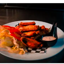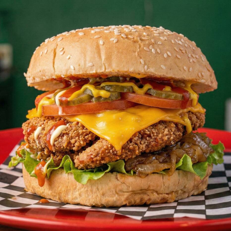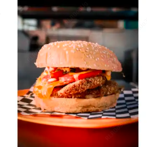 Hamburguesa de carne de pollo, queso amarillo, cebolla caramelizada, lechuga, jitomate, pepinillos, cátsup, mostaza y salsa búfalo.