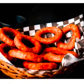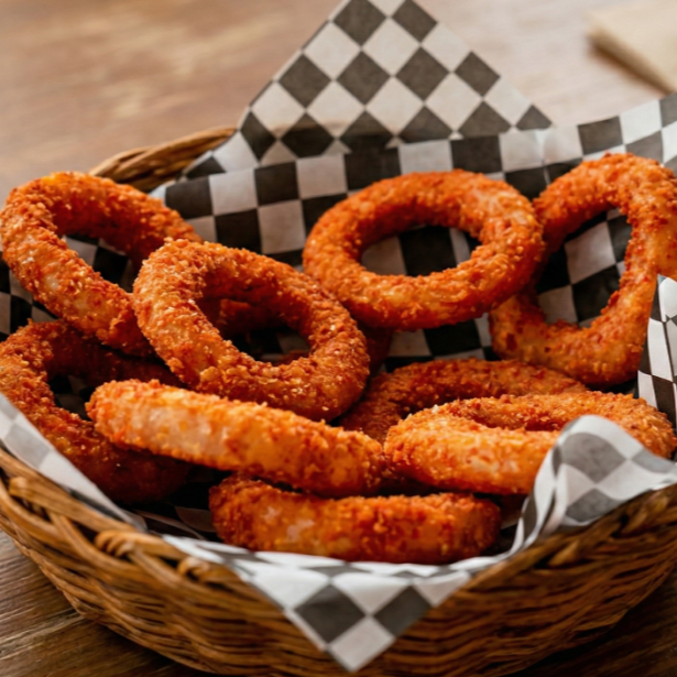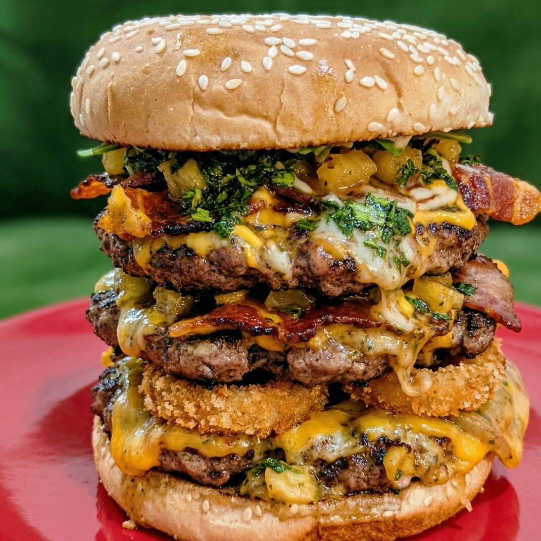 Triple carne de res jugosa, chimichuirri, piña, tocino, doble queso manchego y chedar con crujientes aros de cebolla