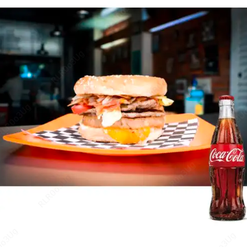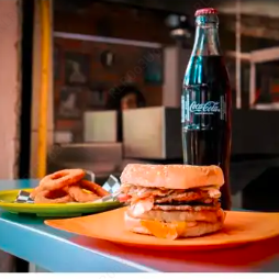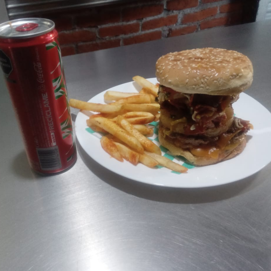 Hamburguesa doble carne de res, queso amarillo o manchego, cebolla caramelizada, lechuga, jitomate, pepinillos, cátsup, mostaza, salsa búfalo, Coca Cola original 600 ml.