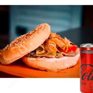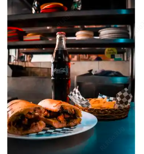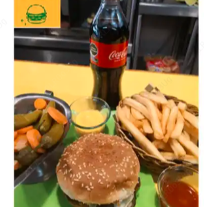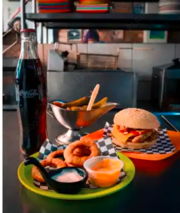 Hamburguesa de carne de res, queso amarillo o manchego, cebolla caramelizada, lechuga, jitomate, pepinillos, cátsup, mostaza, salsa búfalo, Coca Cola sin azúcar.