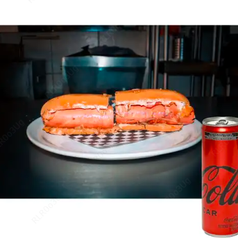 Baguette con salchicha alemana, cebolla caramelizada, mayonesa, mostaza, lechuga, jitomate, salsa búfalo y cátsup, Coca Cola sin azúcar.