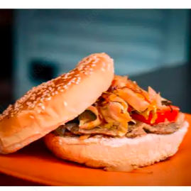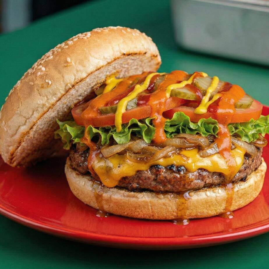 Hamburguesa de carne de res, queso amarillo o manchego, cebolla caramelizada, lechuga, jitomate, pepinillos, cátsup, mostaza y salsa búfalo.