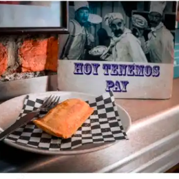 Hamburguesa con carne de res, queso amarillo, cebolla caramelizada, piña, lechuga, jitomate, pepinillos, cátsup, mostaza, salsa búfalo, Coca Cola sin azúcar.