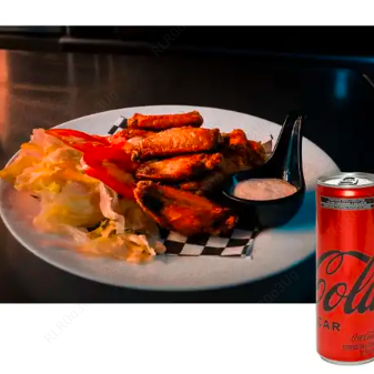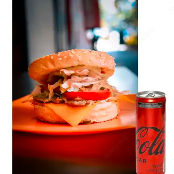 Hamburguesa de carne de pollo, queso amarillo, cebolla caramelizada, lechuga, jitomate, pepinillos, cátsup, mostaza y salsa búfalo, Coca Cola sin azúcar.