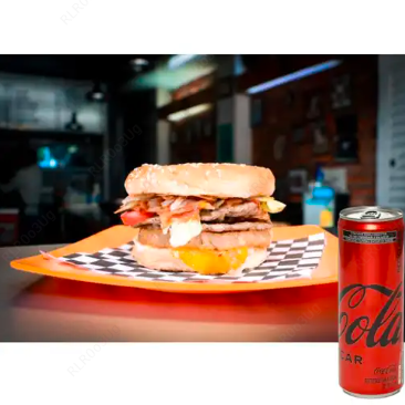 Hamburguesa doble carne de res, queso amarillo o manchego, cebolla caramelizada, lechuga, jitomate, pepinillos, cátsup, mostaza, salsa búfalo, Coca Cola sin azúcar.