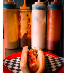 Salchicha de pavo, aderezos, cátsup, mostaza, salsa búfalo, pepinillos y opcional: jitomate, cebolla y mayonesa.