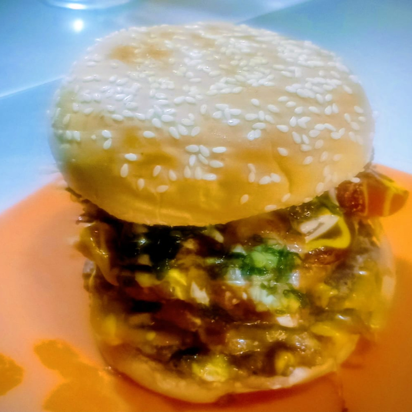 Hamburguesa con doble carne de res, queso amarillo o manchego, cebolla caramelizada, lechuga, jitomate, pepinillos, cátsup, mostaza y salsa búfalo.