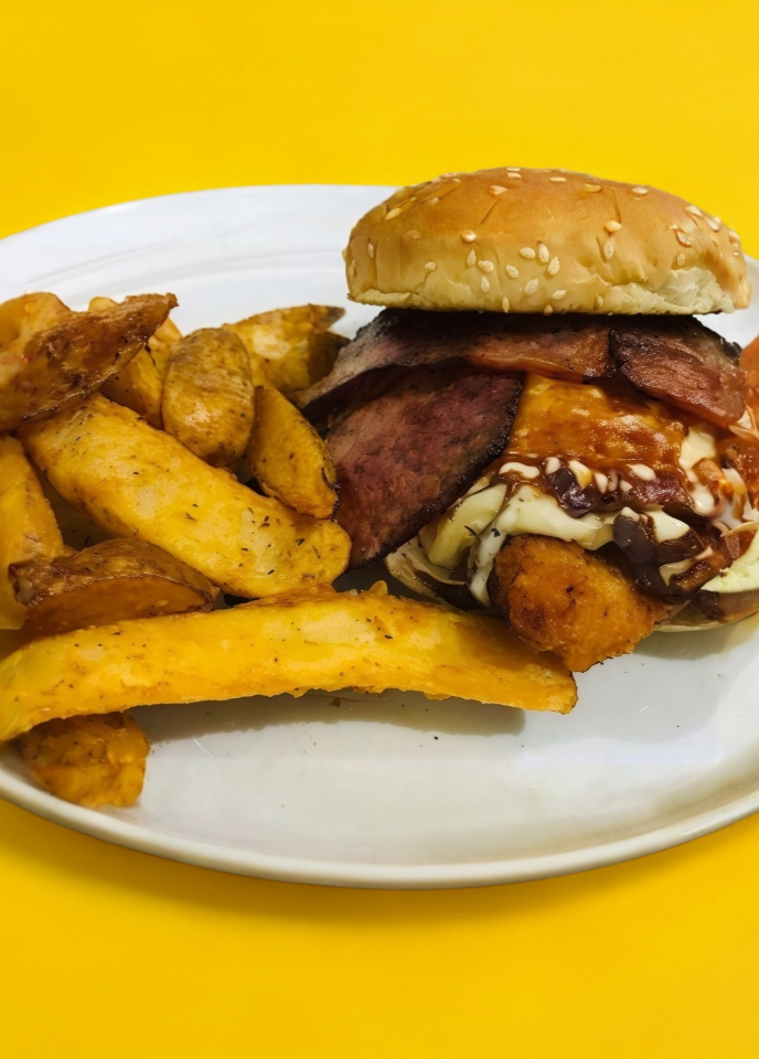 Hamburguesa especial de pollo con queso + papas gajo + refresco.