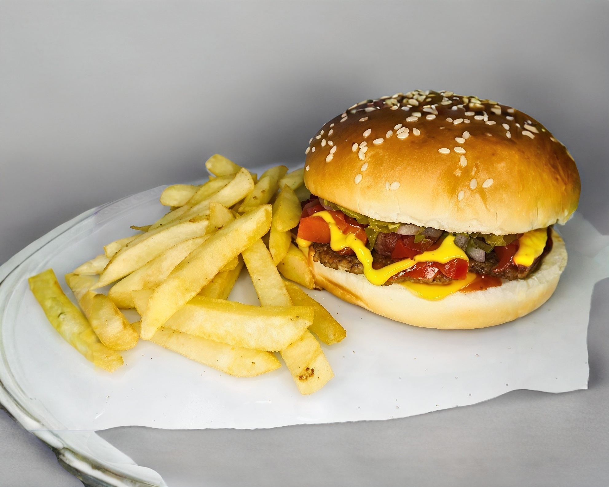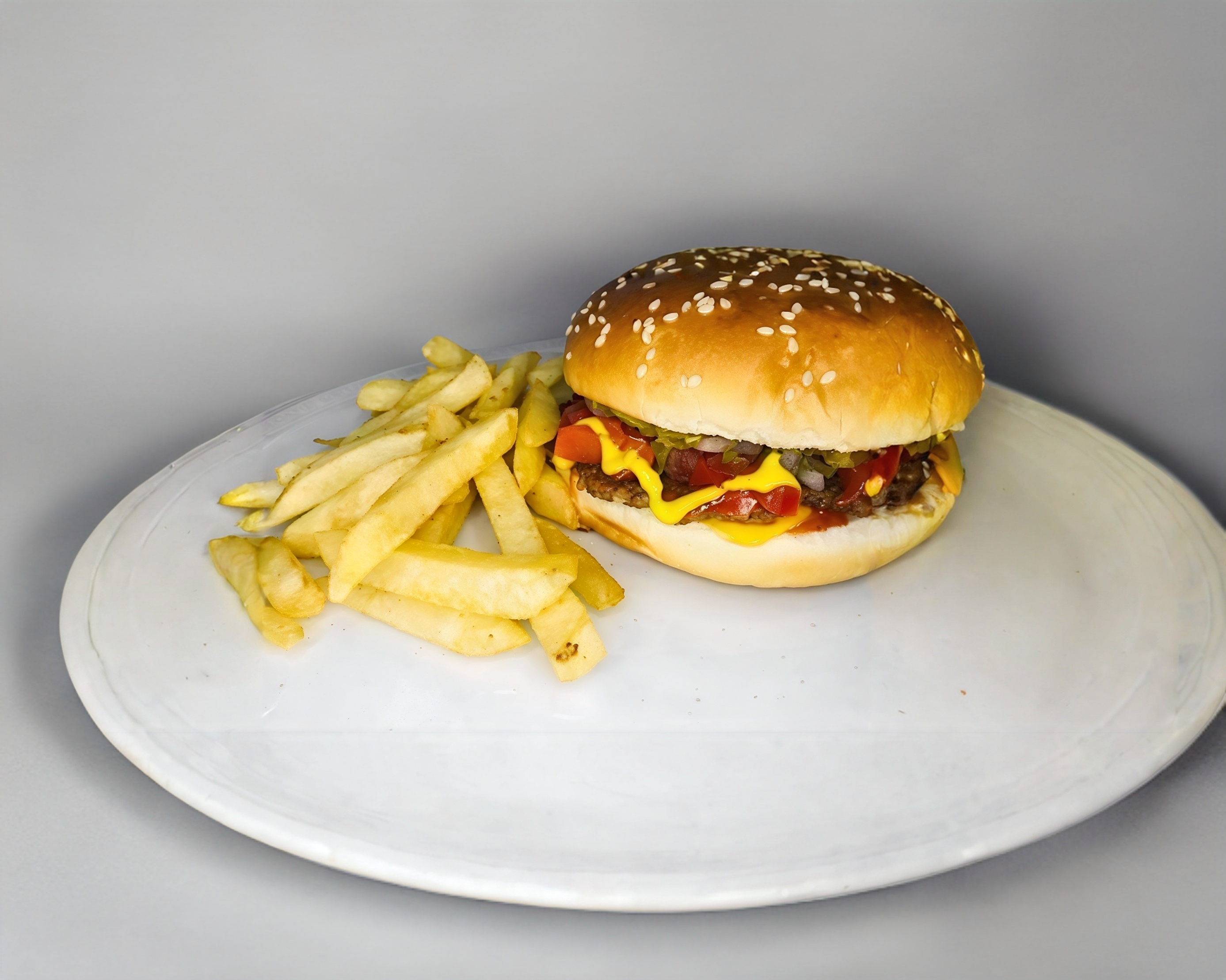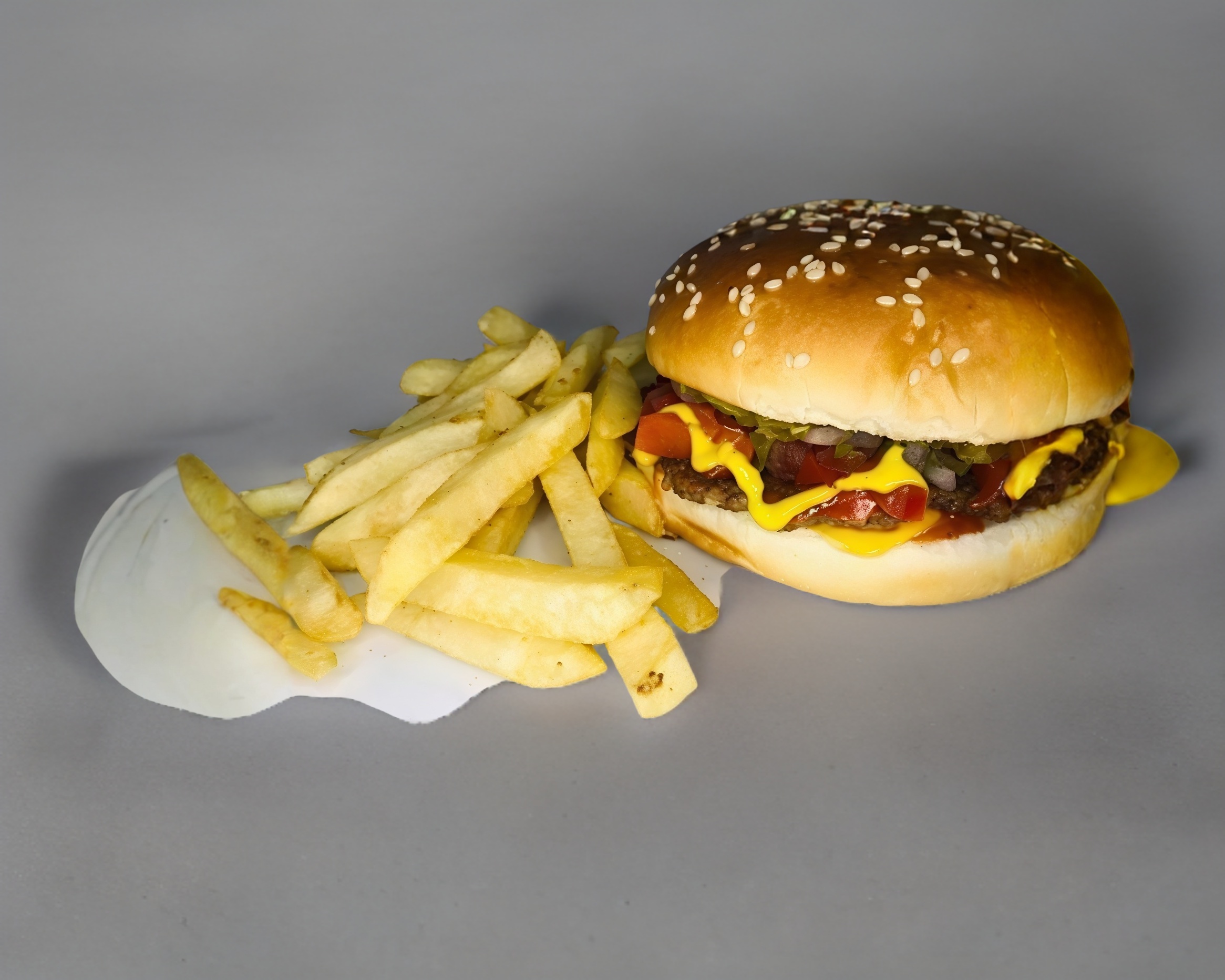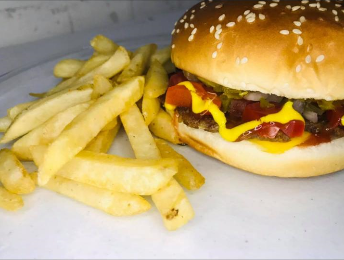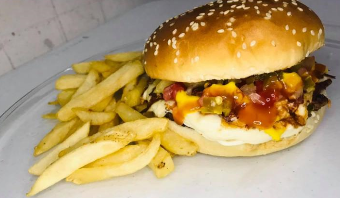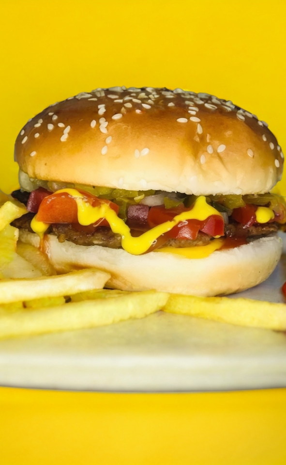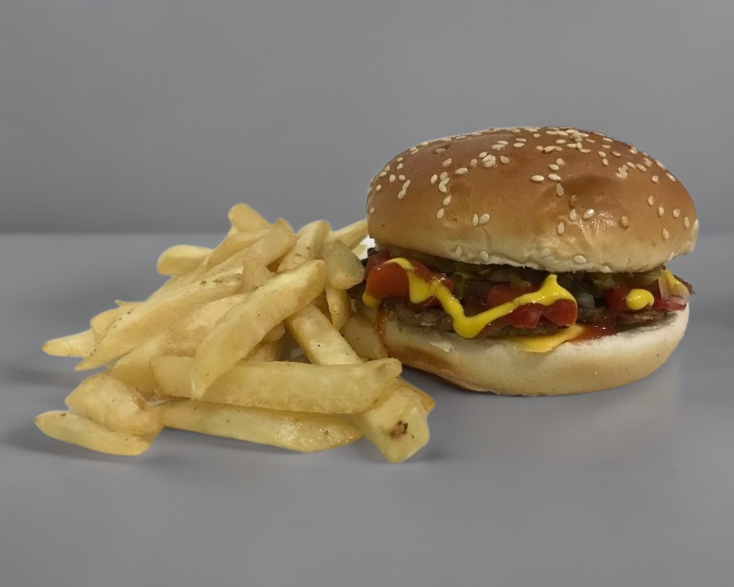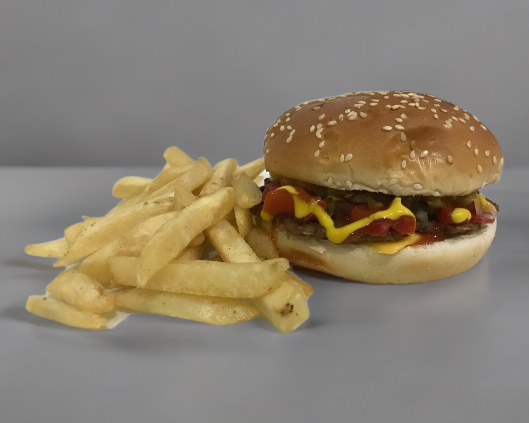 Carne 100% de res, una rebana de queso amarillo estilo americano. No incluye papas.