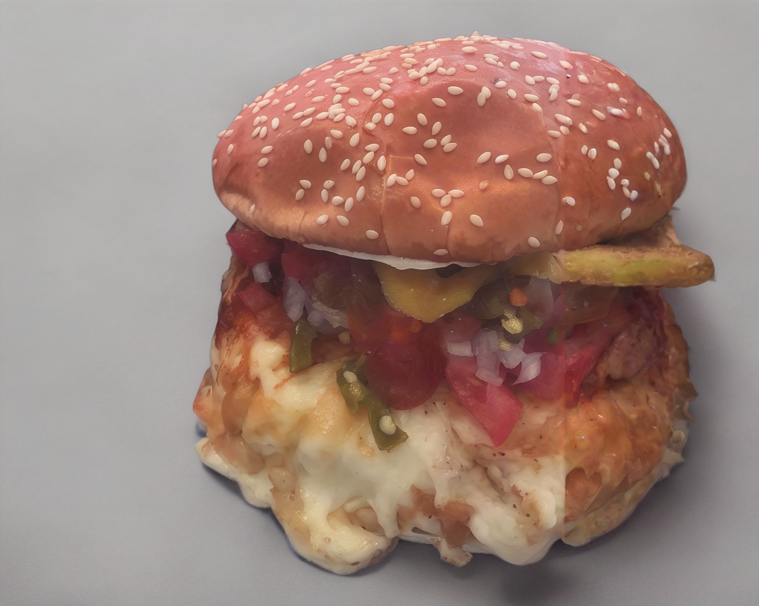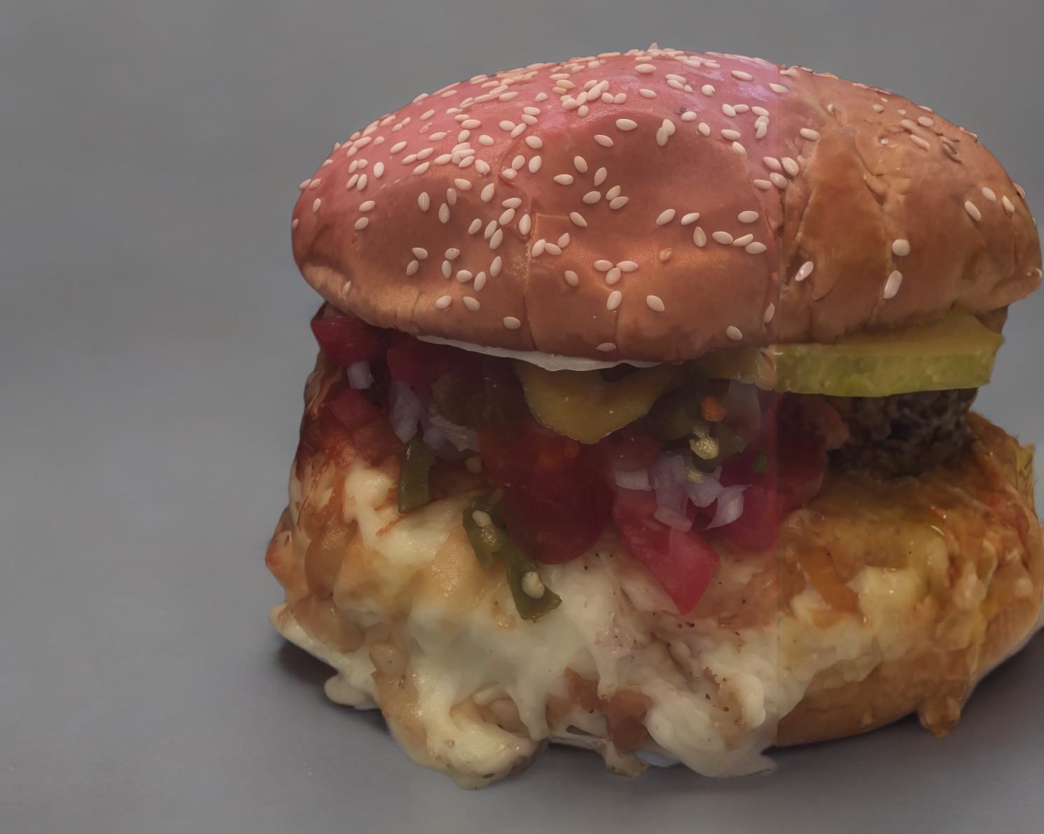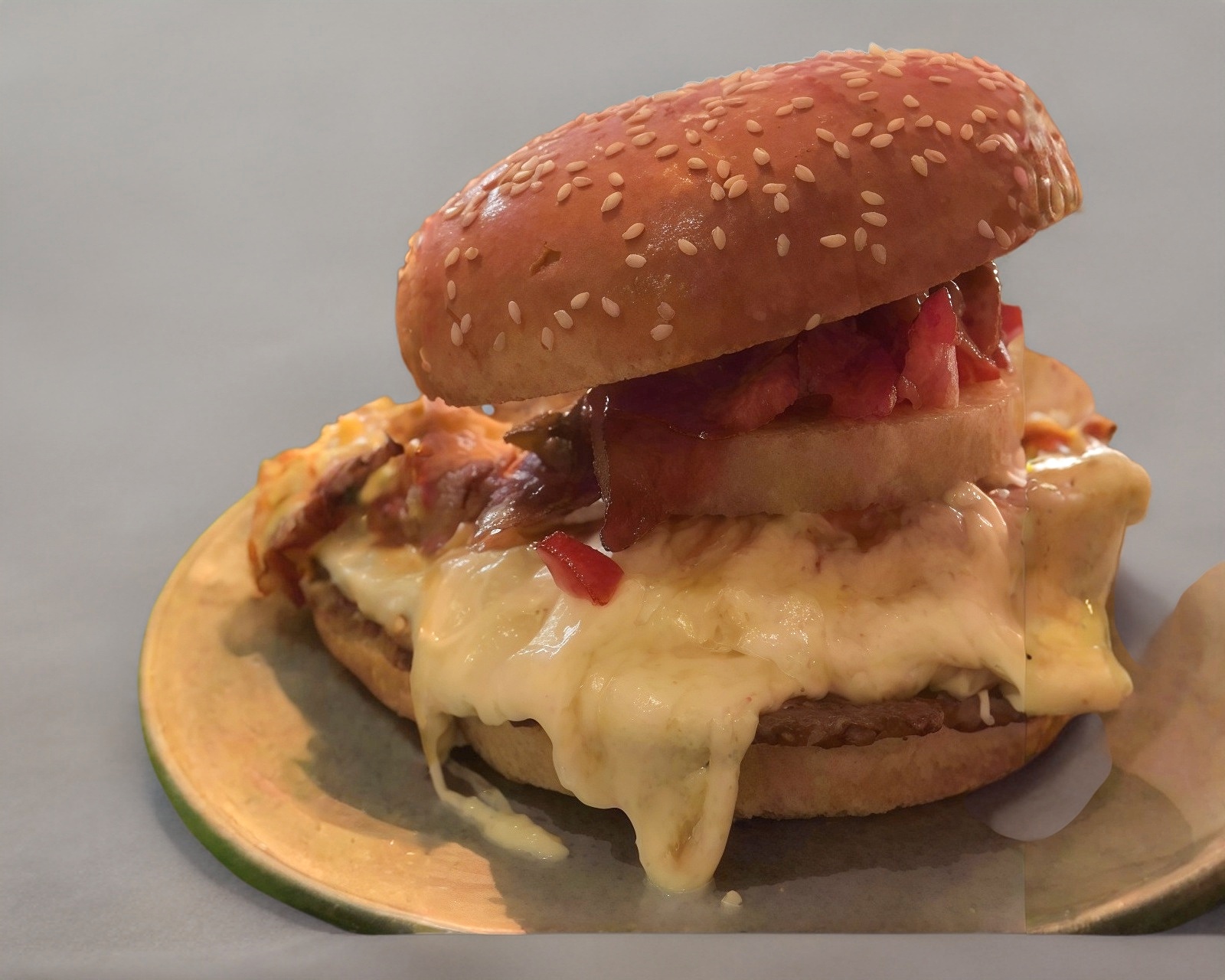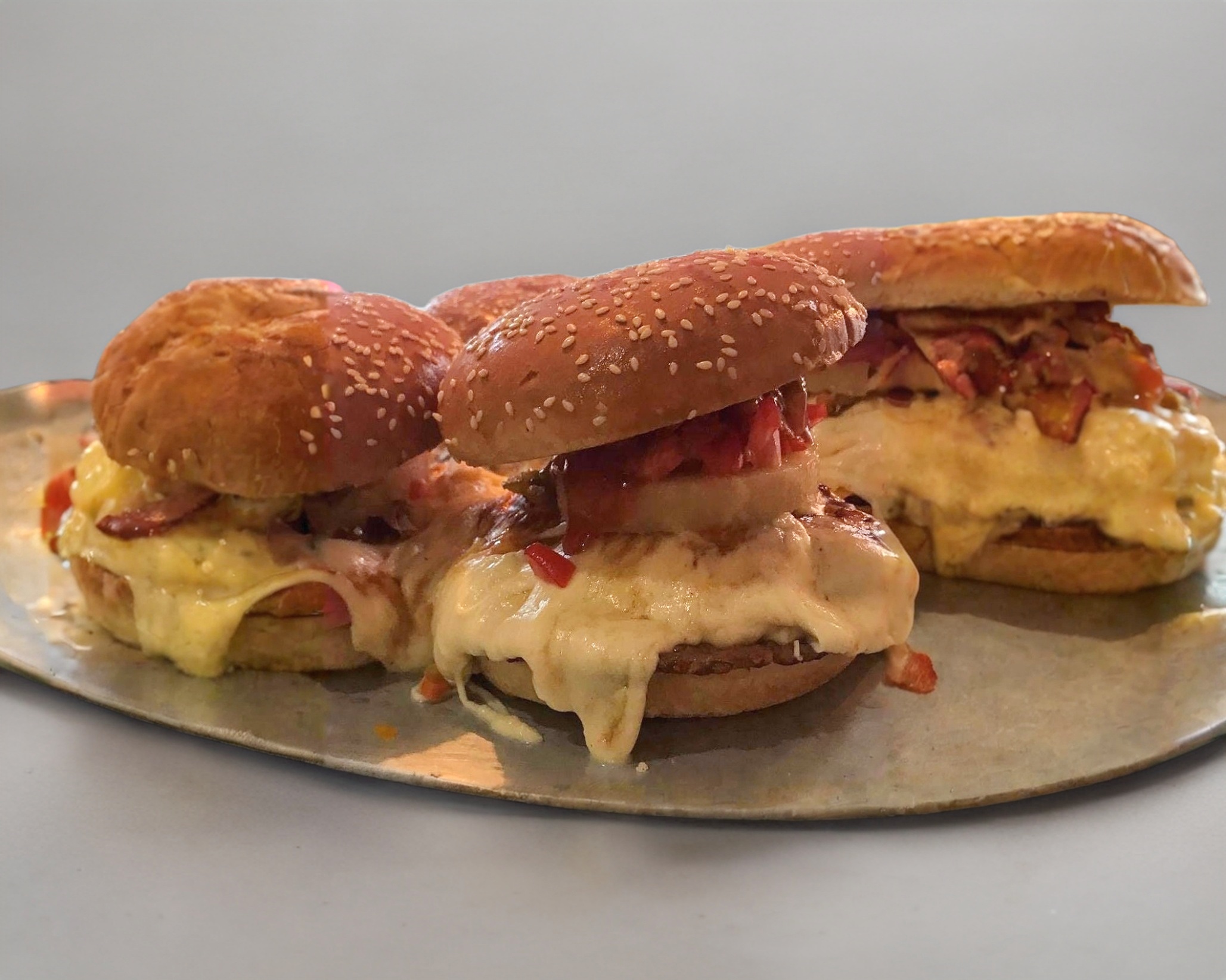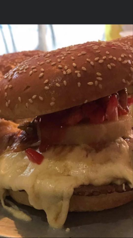 Carne 100% de res, una rebana de queso amarillo estilo americano, 75 gramos de queso Oaxaca.