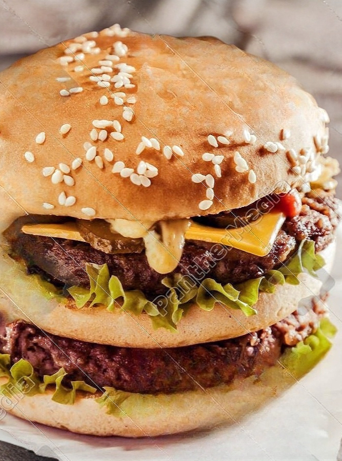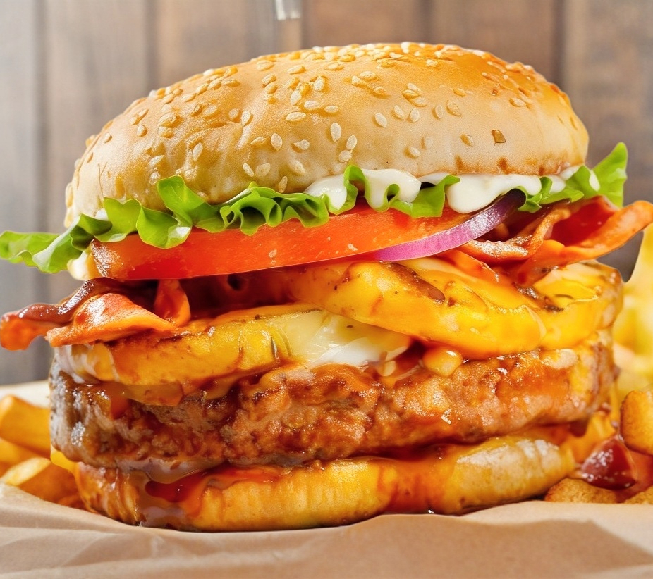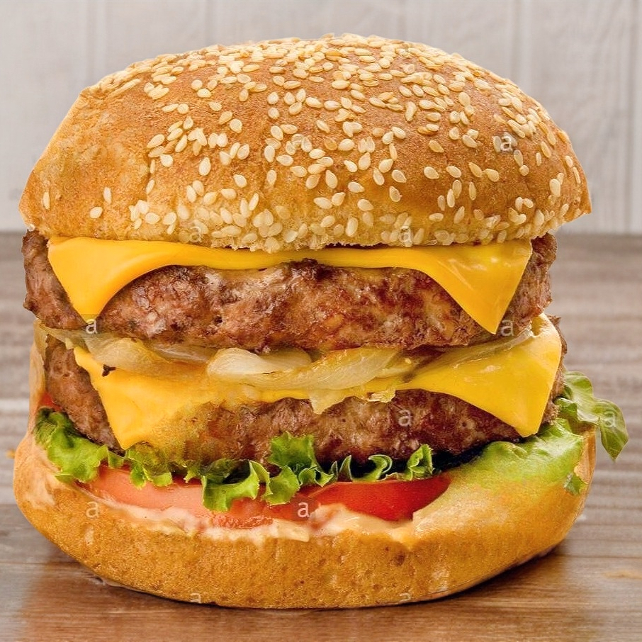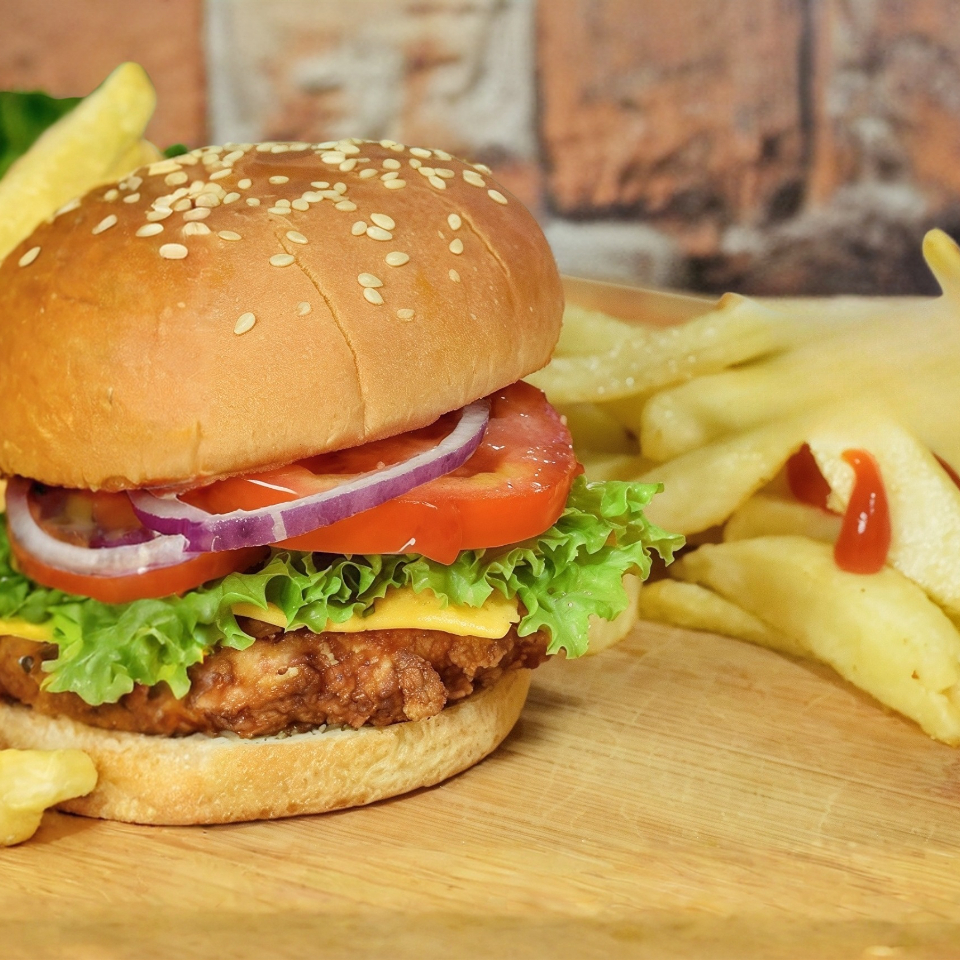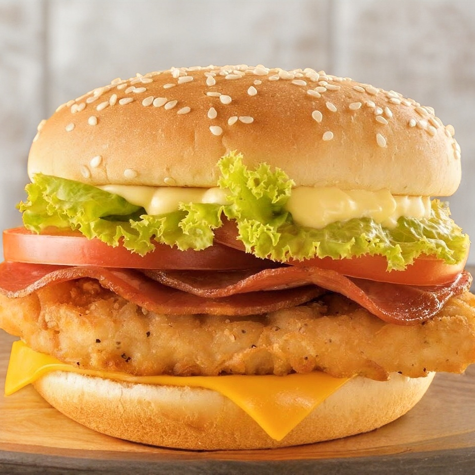 Hamburguesa de pollo, queso oaxaca, queso amarillo, cebolla, jitomate, picante, lechuga, mostaza y cátsup.