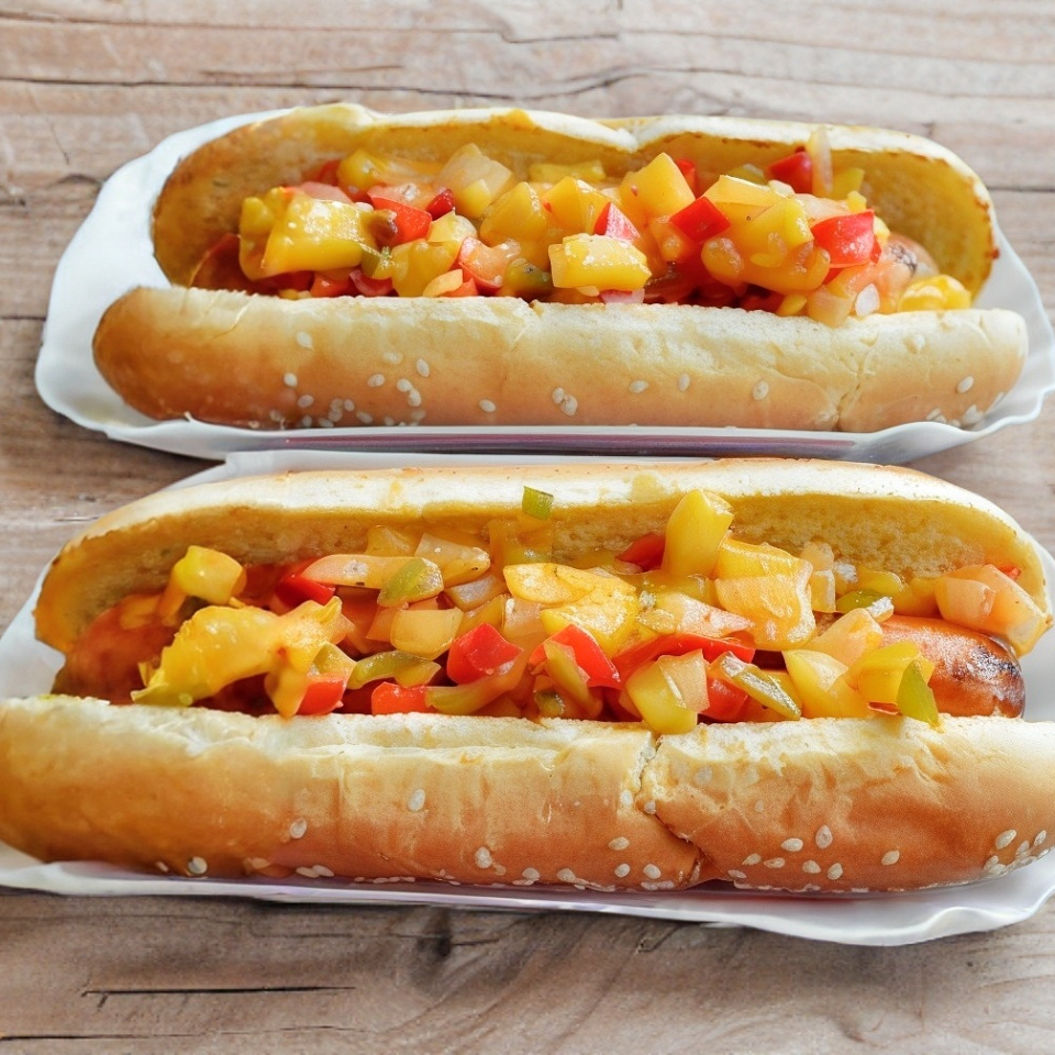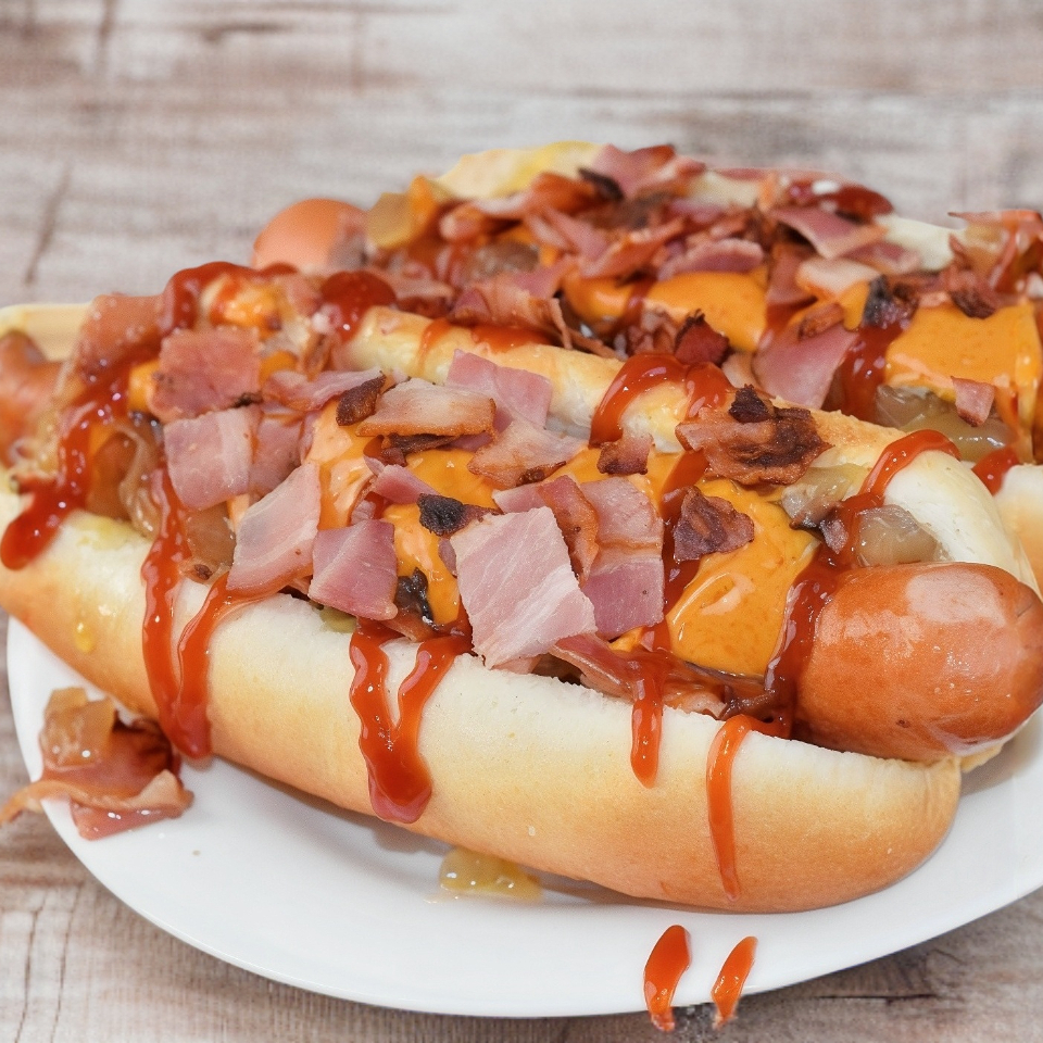 Hot dog gigante, jitomate, cebolla, picante, mostaza, cátsup y lleva tocino.