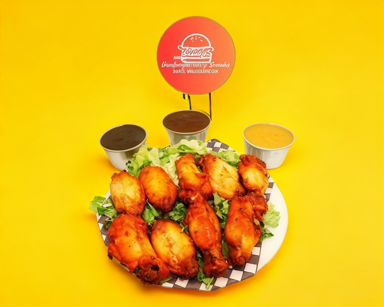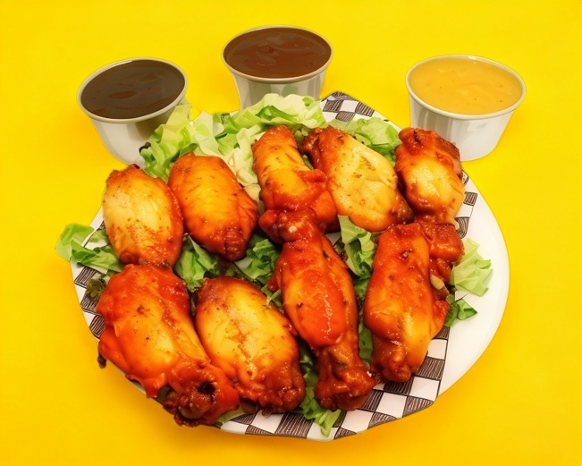 9 alitas al carbón con salsa Bbq en cama de lechuga, acompañado de julianas de pepino y aderezo